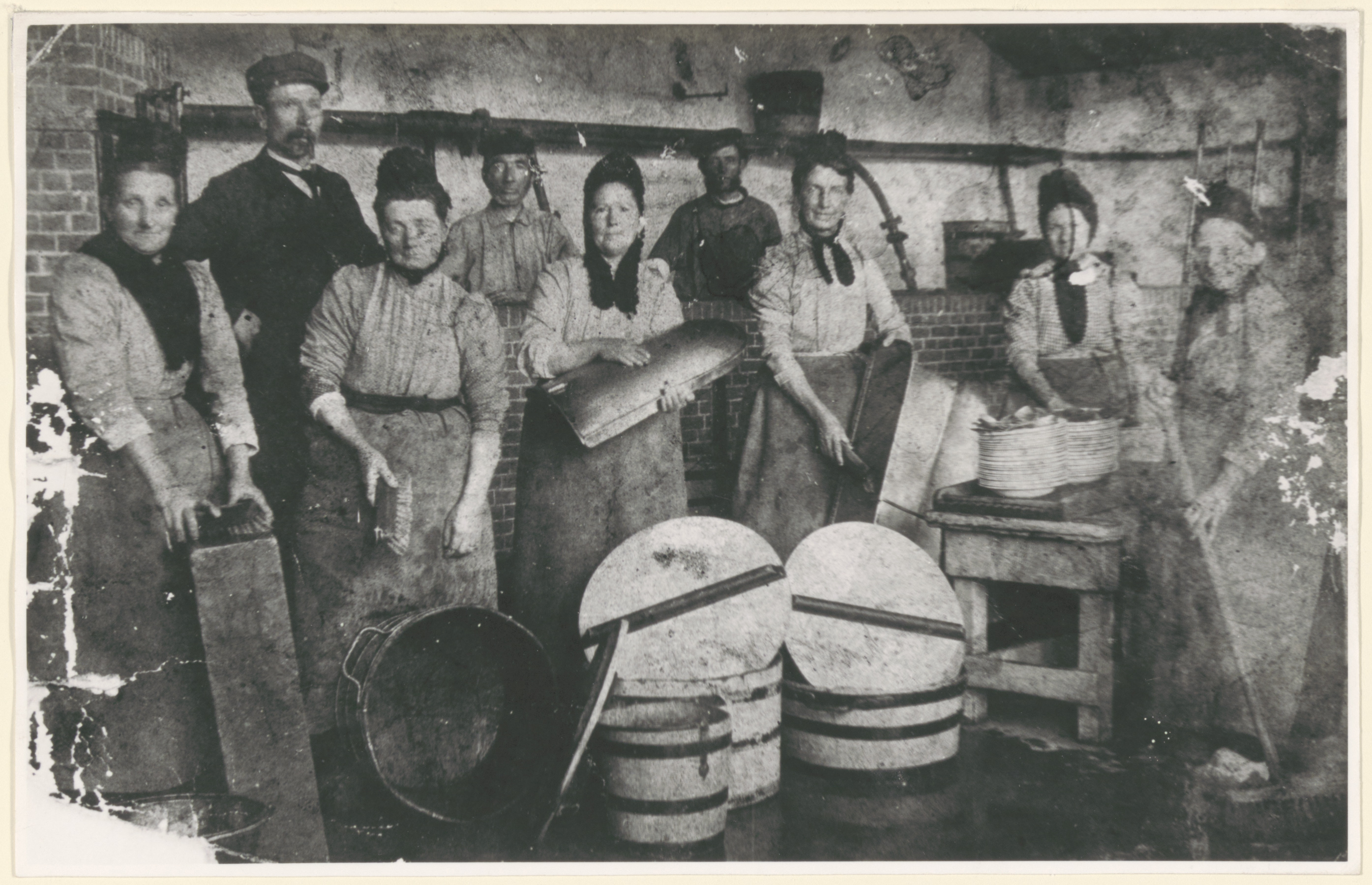 - Interieur met personeel van de soepkokerij aan het Steegoversloot, hoek Museumstraat. 6e persoon van links is Bastiaan de Koning.