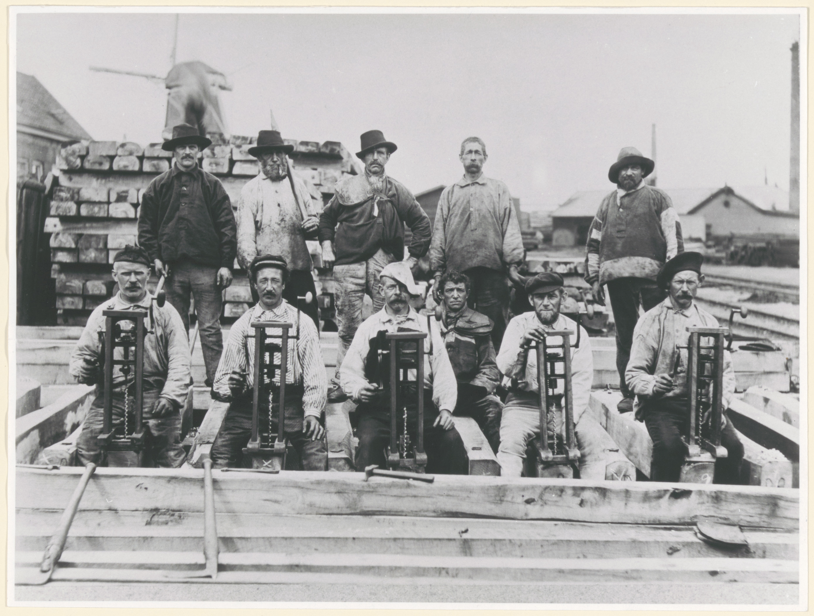 Elf arbeiders poseren op de creosoteerwerf van de Staatsspoorwegen aan de Weeskinderendijk. De voorste vijf maken met handboormachines gaten in bielzen. Mogelijk ook het houtbereidingsbedrijf van Cornelis Gips & Zn. aan de 's-Gravendeelsedijk. Vooraan 2e van links is Johannes Pluimert.
