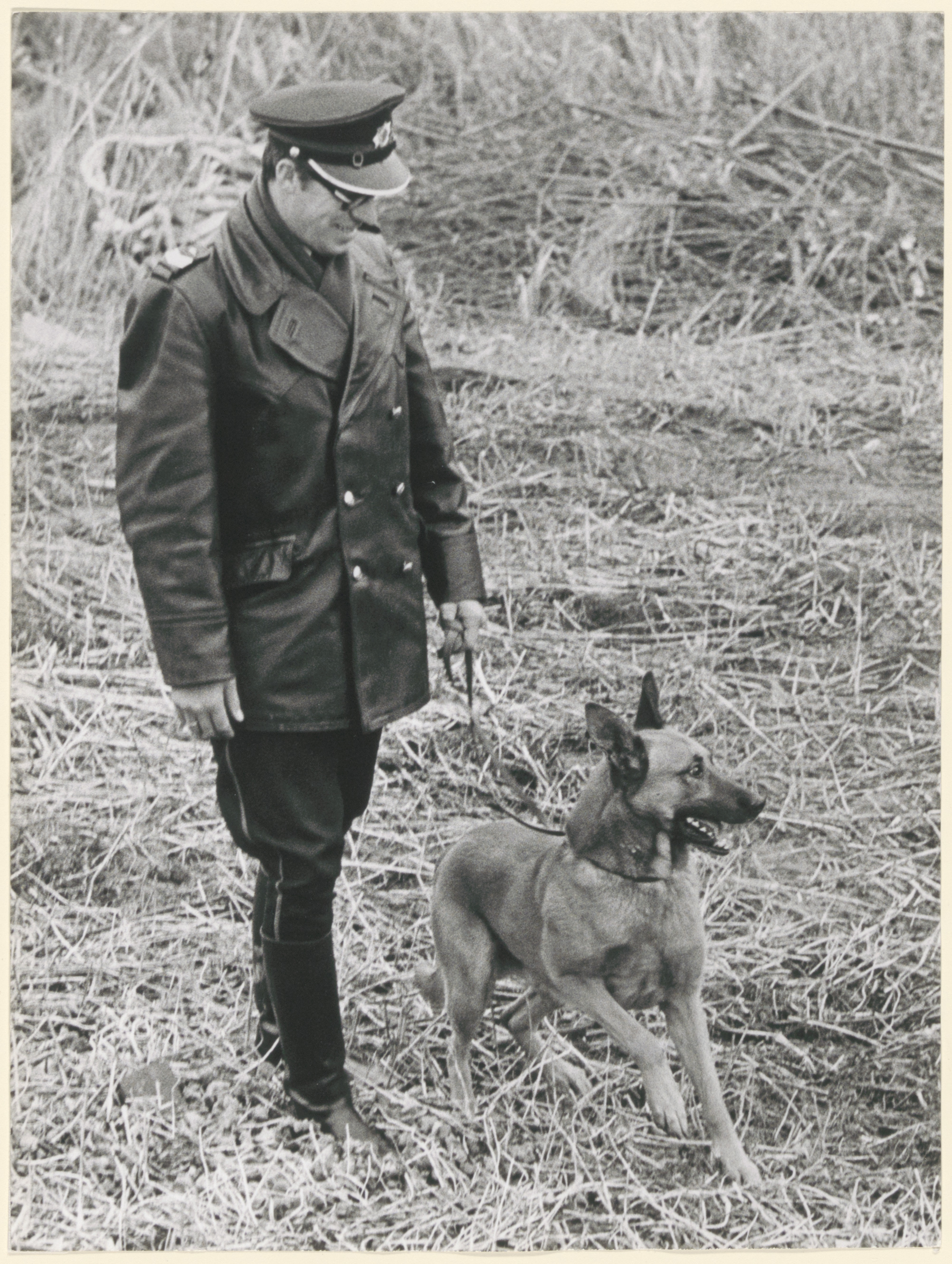 - Agent K. de Korver van de politiepost Willemsdorp met de op 10 april 1965 in politiedienst getreden herdershond Nero ergens in de Biesbosch.