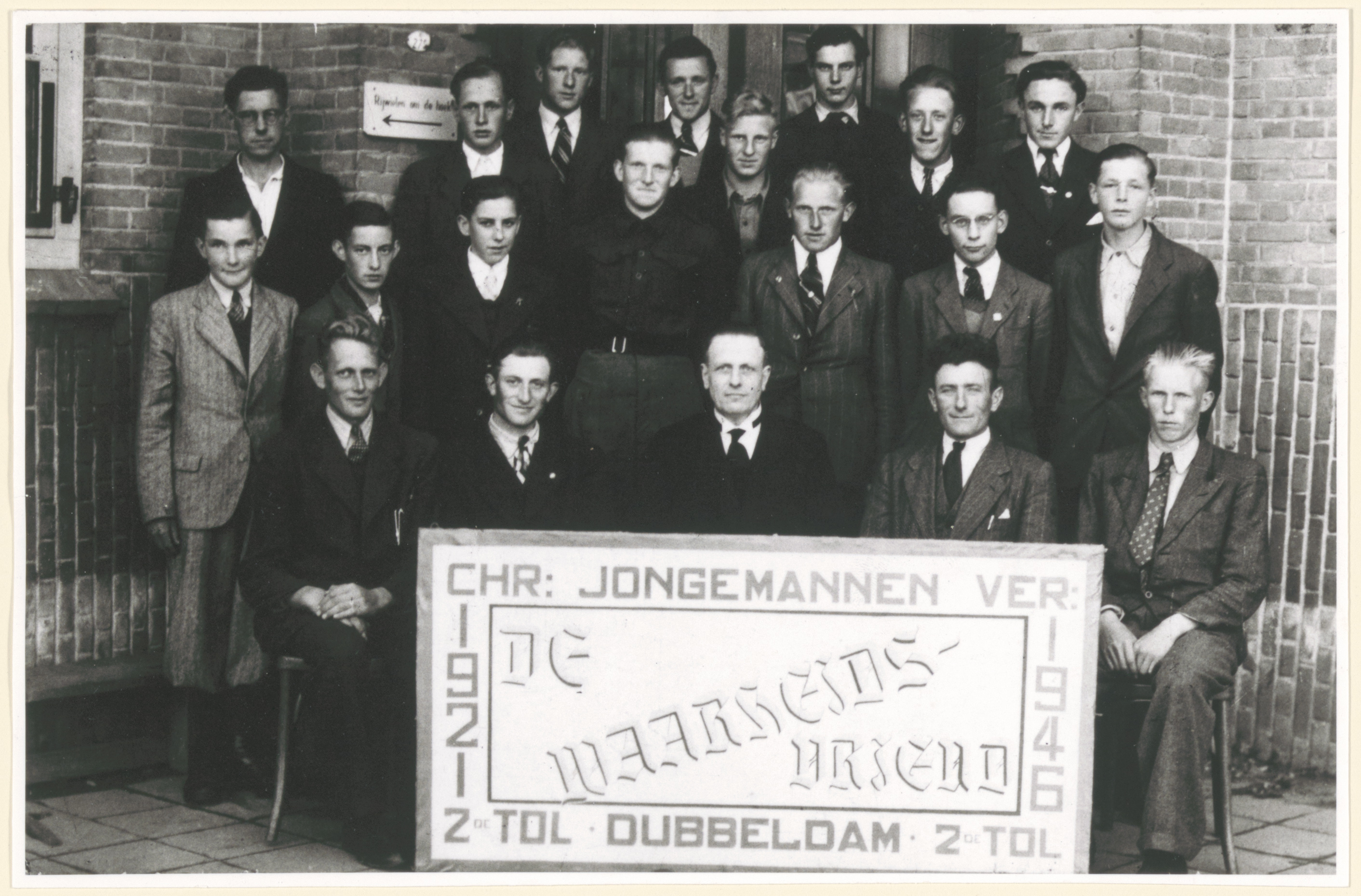 De Christelijke Jongemannenvereniging De Waarheidsvriend van de Tweede Tol Dubbeldam, bij het 25-jarig jubileum in 1946.