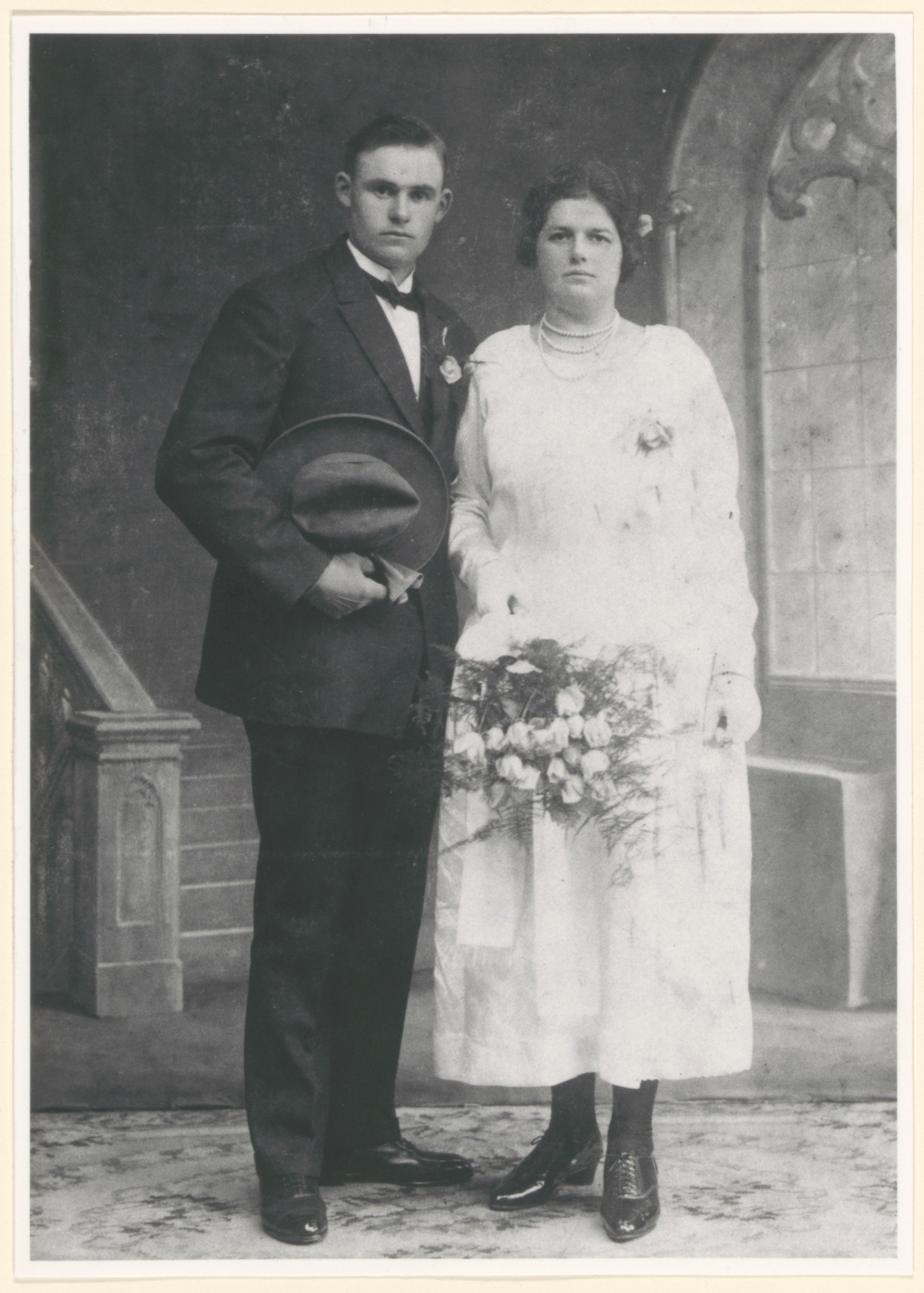 Huwelijksportret in een kerkdecor van melkboer Arie van Ballegooie (Dubbeldam 28 …