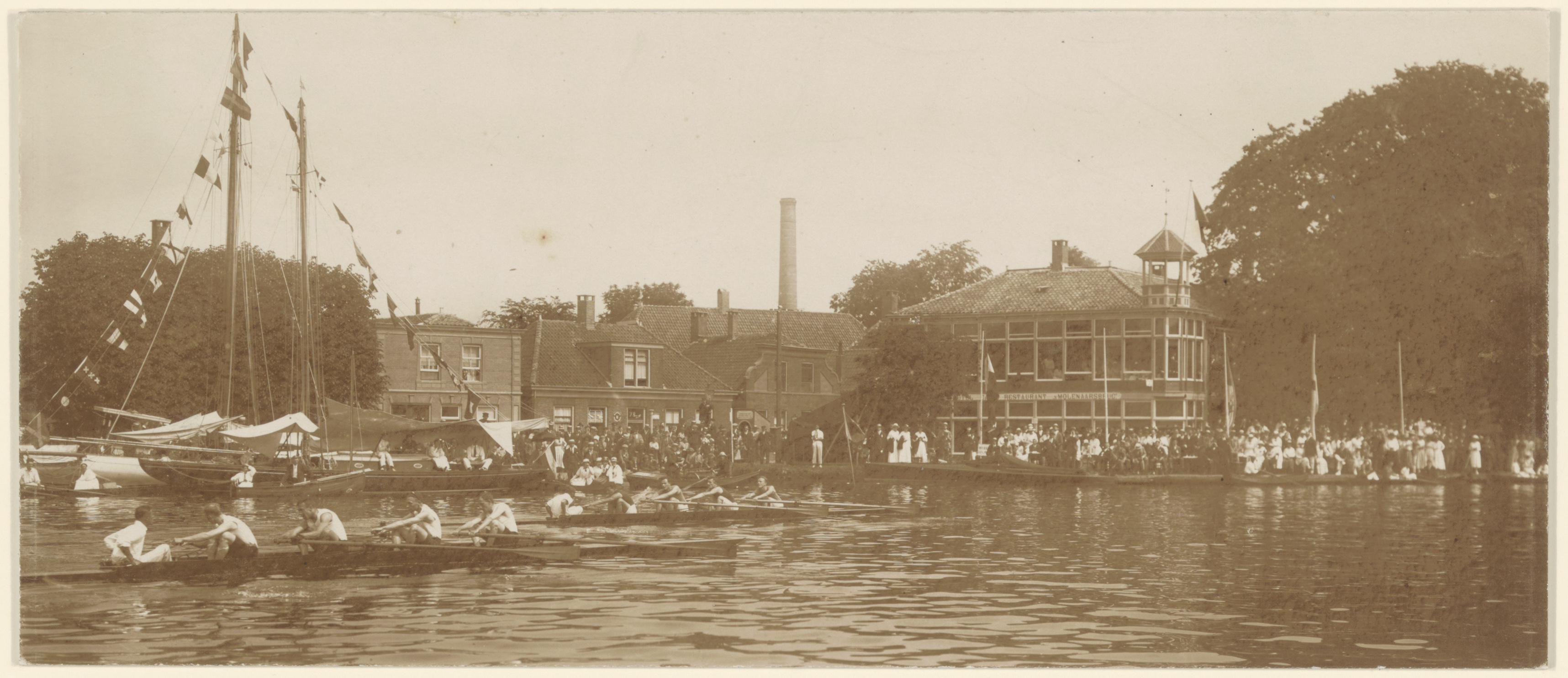 - Hollandia roeiwedstrijd op de Oude Rijn bij 's-Molenaarsbrug (nabij Oudshoorn) in de buurt van Alphen aan den Rijn. Heren 4 met stuurman; waarschijnlijk is de Koninklijke Dordrechtse Roei- en Zeilvereniging ook vertegenwoordigd.