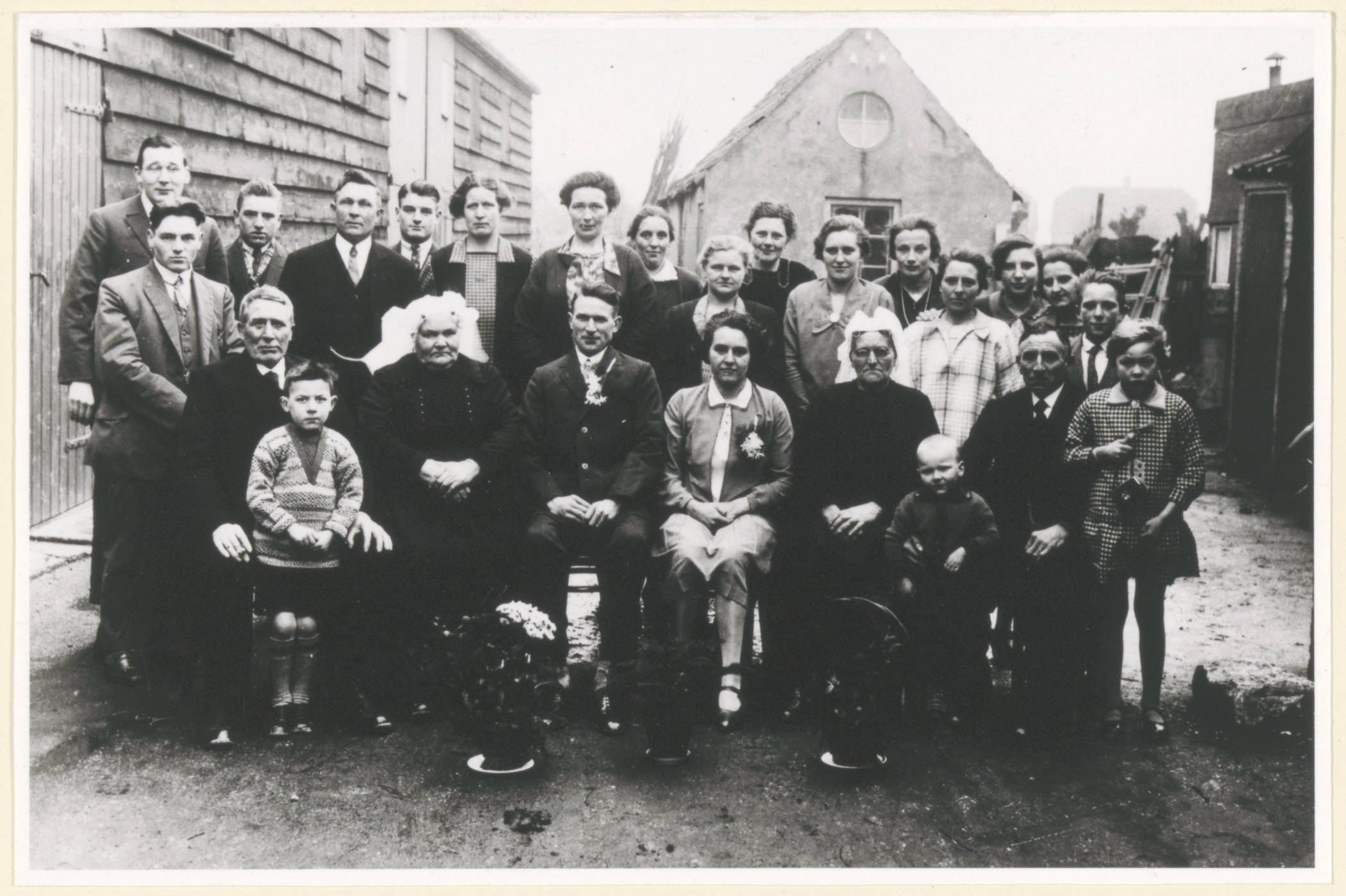 Trouwfoto van Rokus de Jong en Aagje in 't Veld, poserend met familie bij de kerk aan de Dubbelsteynlaan; Aagje is vermoedelijk geboren op 2 oktober 1905.