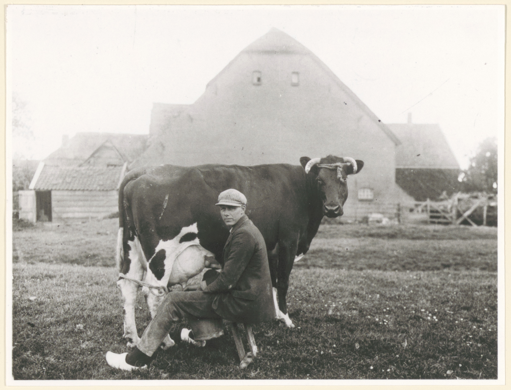 - Boer Jan van de Merwe (geboren 6 februari 1912, overleden november 1979), een koe melkend achter zijn boerderij aan de Vissersdijk nr. 38 (oud adres Visschertje), ca. 1938.