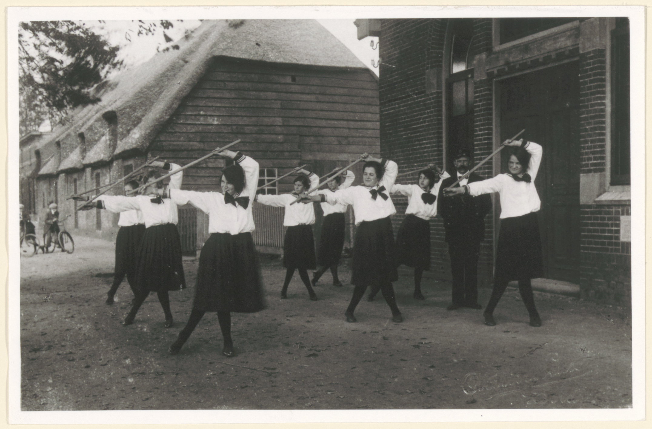 Acht leden van een Dubbeldamse Damesturnclub oefenen met stokken onder het toeziend oog …
