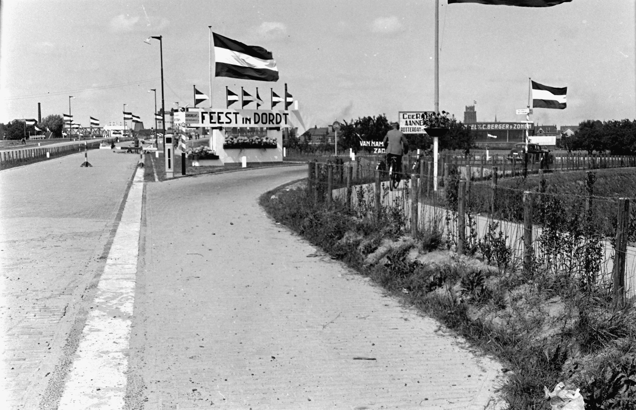 - Versierde afrit van Rijksweg 16 naar de Hugo de Grootlaan tijdens de brugfeesten bij de opening van de verkeersbrug over de Oude Maas.