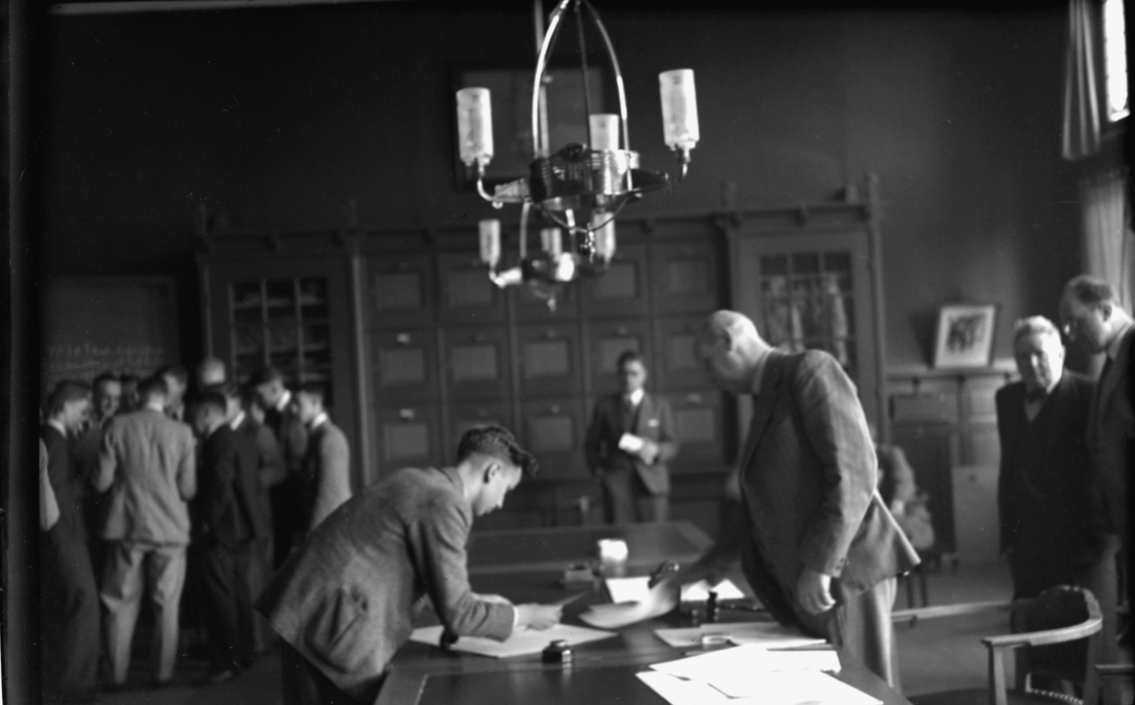 - Docentenkamer van de H.B.S. in het Oranjepark waar leerlingen na het eindexamen hun diploma ontvangen van directeur dr. J.J. Prins.