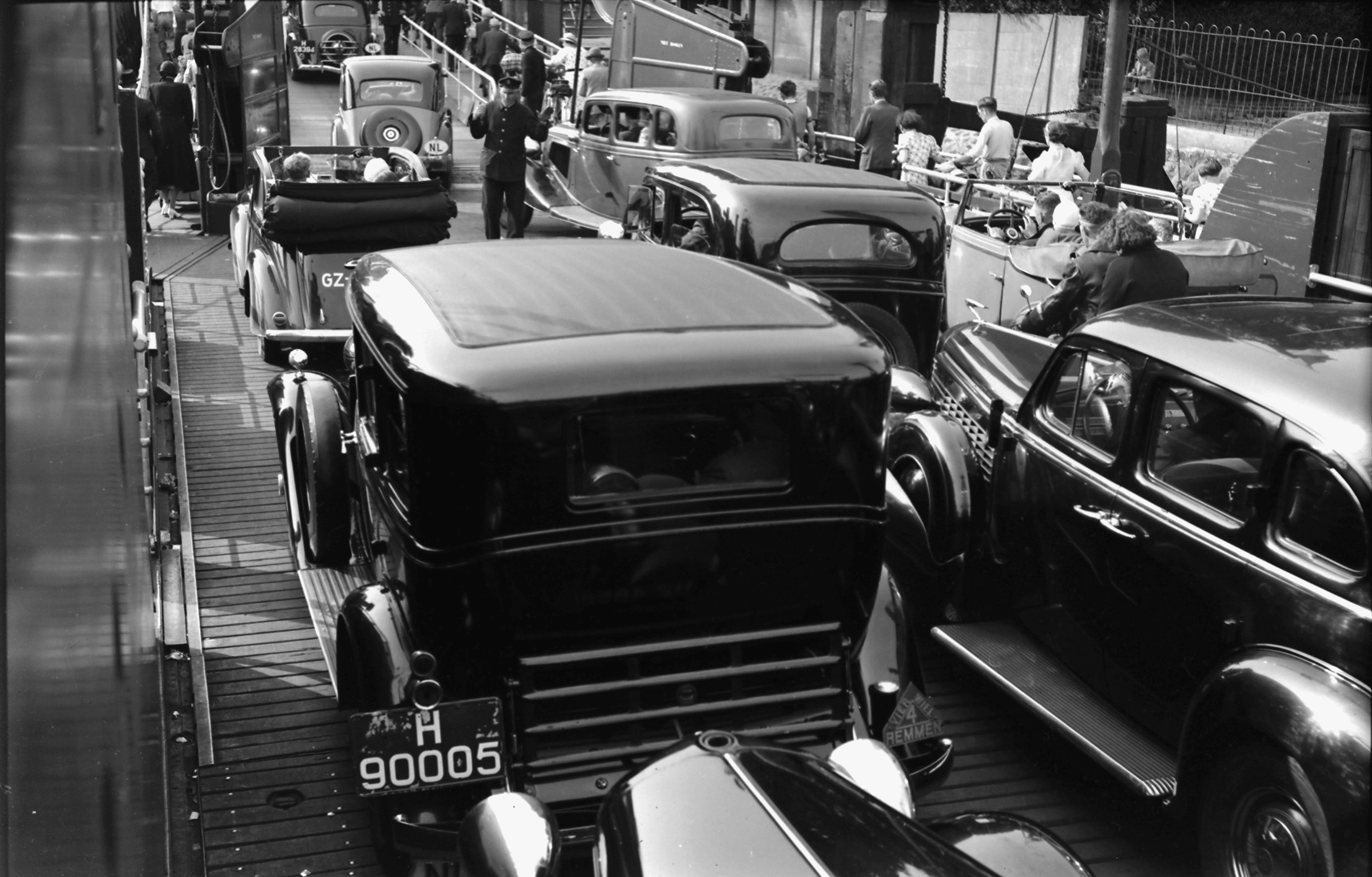 Passagiers en voertuigen gaan op de pont bij het Zwijndrechts veer aan de Buiten Walevest.