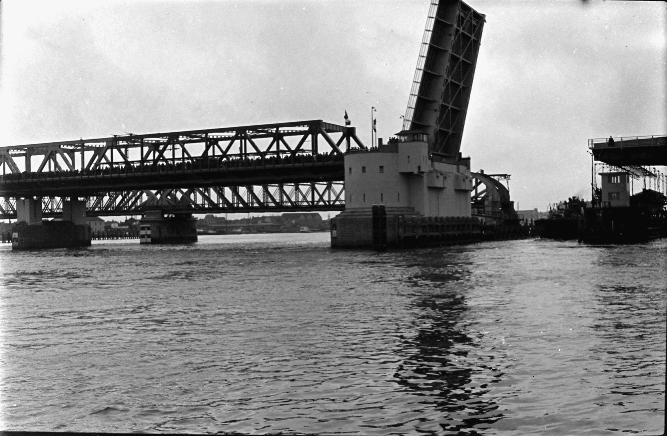 Geopende klep van de in aanbouw zijnde verkeersbrug en de ernaast gelegen spoorbrug over de Oude Maas.
