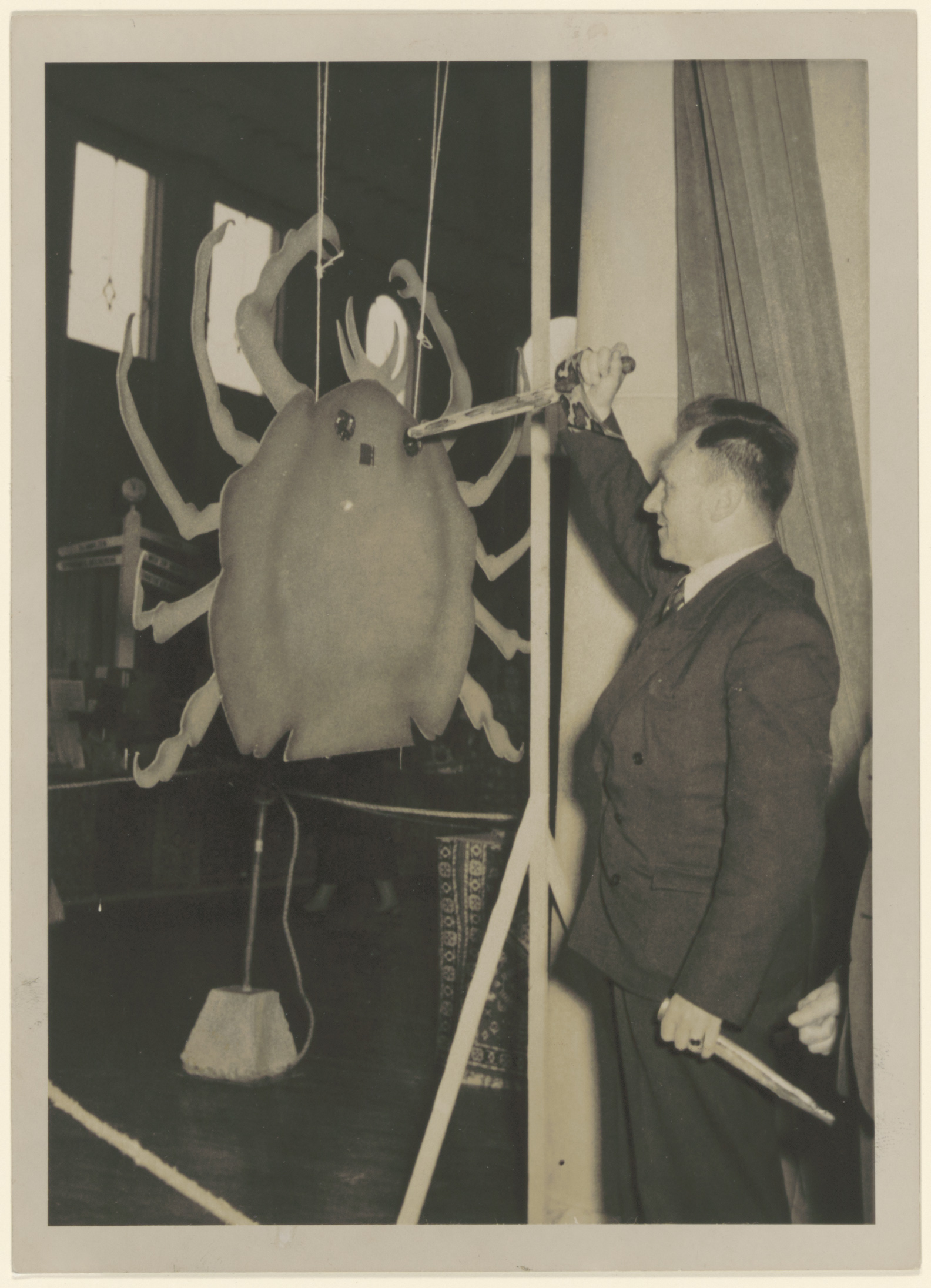 - Burgemeester mr. J.A.H.J van der Dussen heft een mes en dreigt daarmee het oog van een kartonnen krab of kreeft te doorboren; het beest is kennelijk zo gevaarlijk dat hij een tweede mes in de linkerhand gereedhoudt; mogelijk betreft het hier de opening van een consultatiebureau kankerbestrijding of het startsein voor een collecte daarvoor.