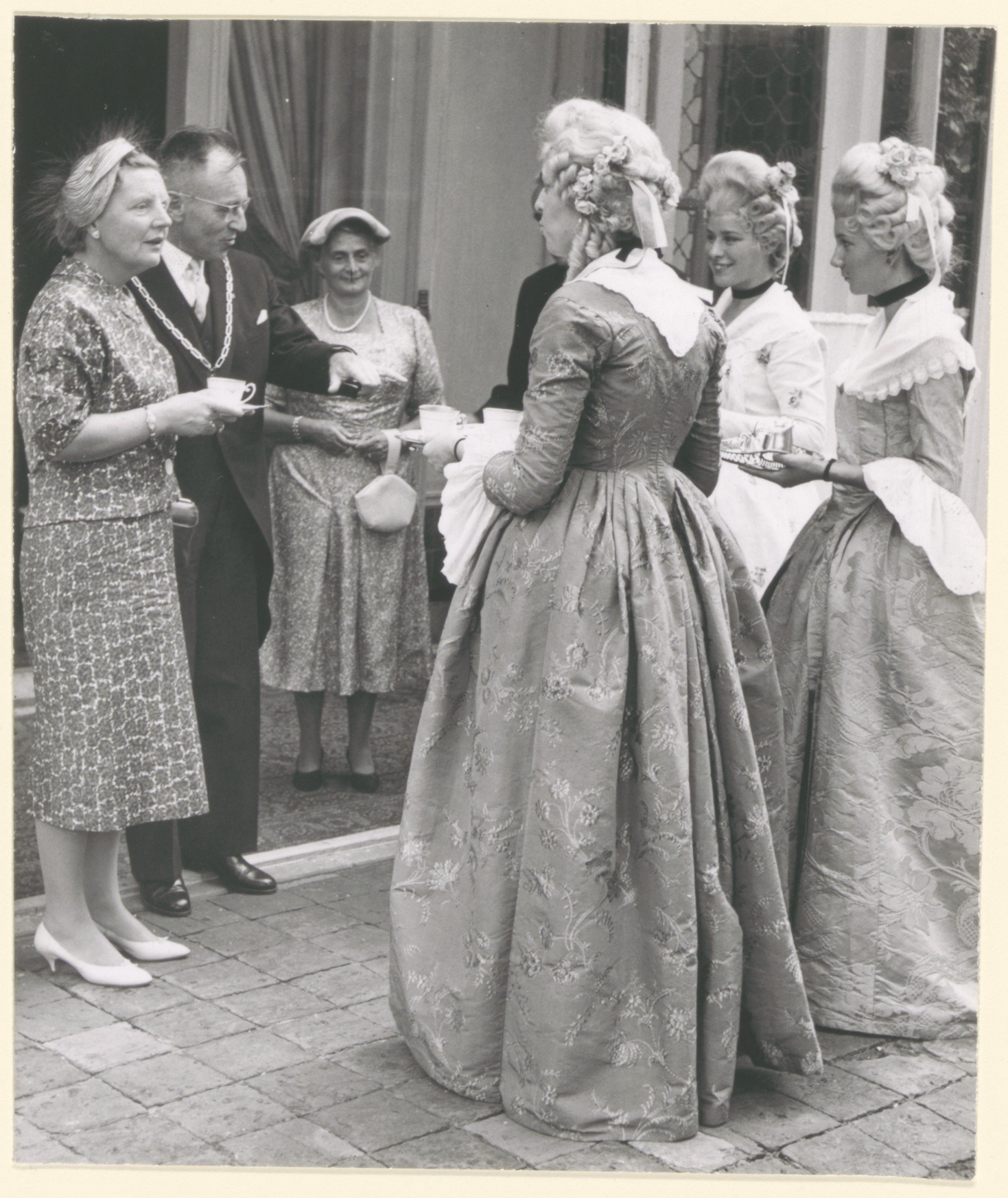 - Koffiepauze in museum Van Gijn tijdens het bezoek van koningin Juliana aan de stad om de Julianahaven te openen. Ze wordt geflankeerd door burgemeester Van der Dussen en converseert met drie dames met pruik in oud-modische kledij.