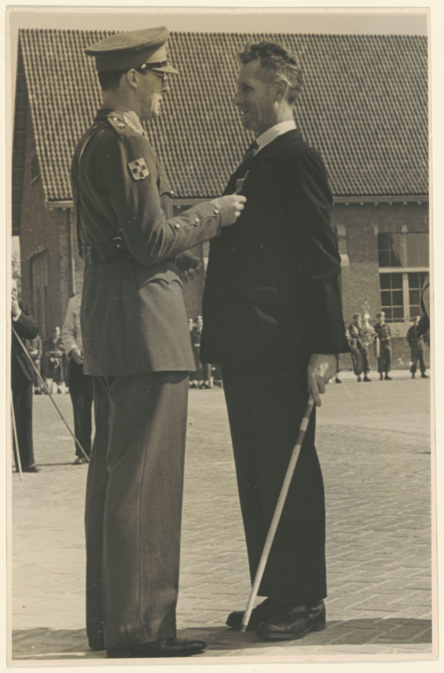 Uitreiking door prins Bernhard van een militaire onderscheiding, de bronzen leeuw, aan Pieter van Noort, militair oorlogsslachtoffer (met blindenstok) sinds mei 1940, waarschijnlijk op het terrein van de KMA te Breda.