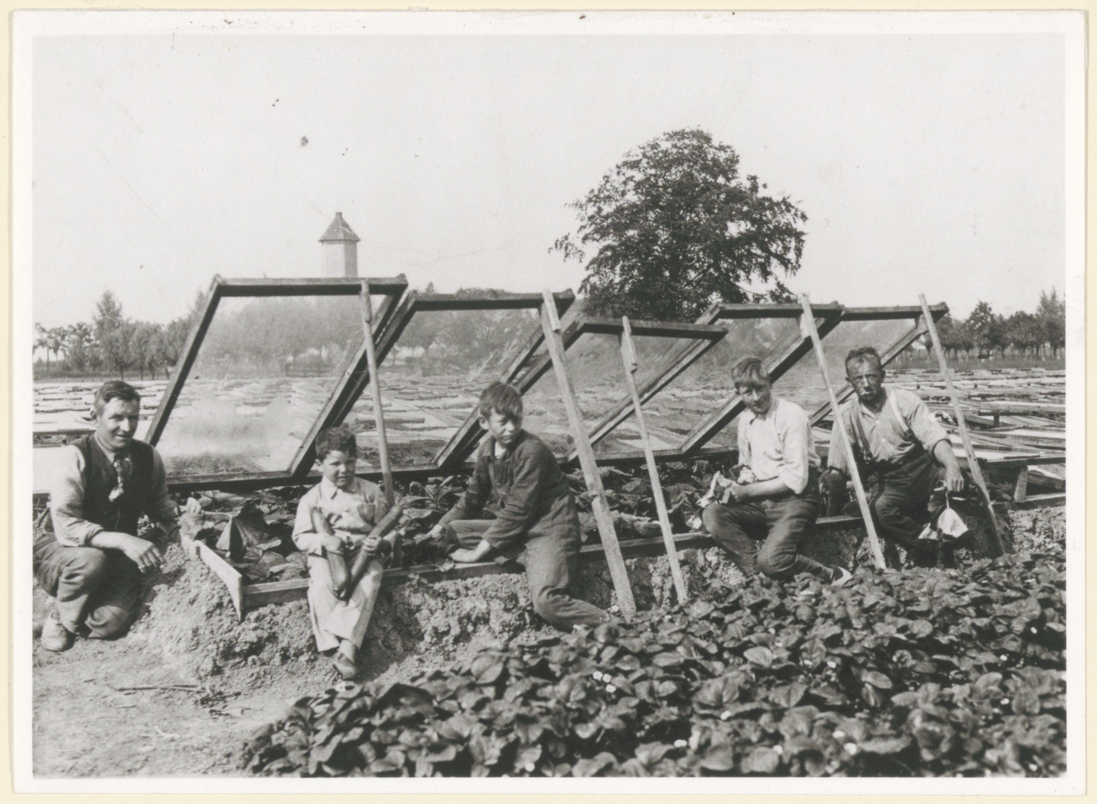 - Een vijftal Dubbeldamse tuinders voor een plat glas-kas met komkommer en sla nabij de Oudendijk; op de achtergrond de watertoren. V.l.n.r. Toon Vermeij, Leen de Deugd, Jos Stam, Jos Vermeij en Henk Munter.