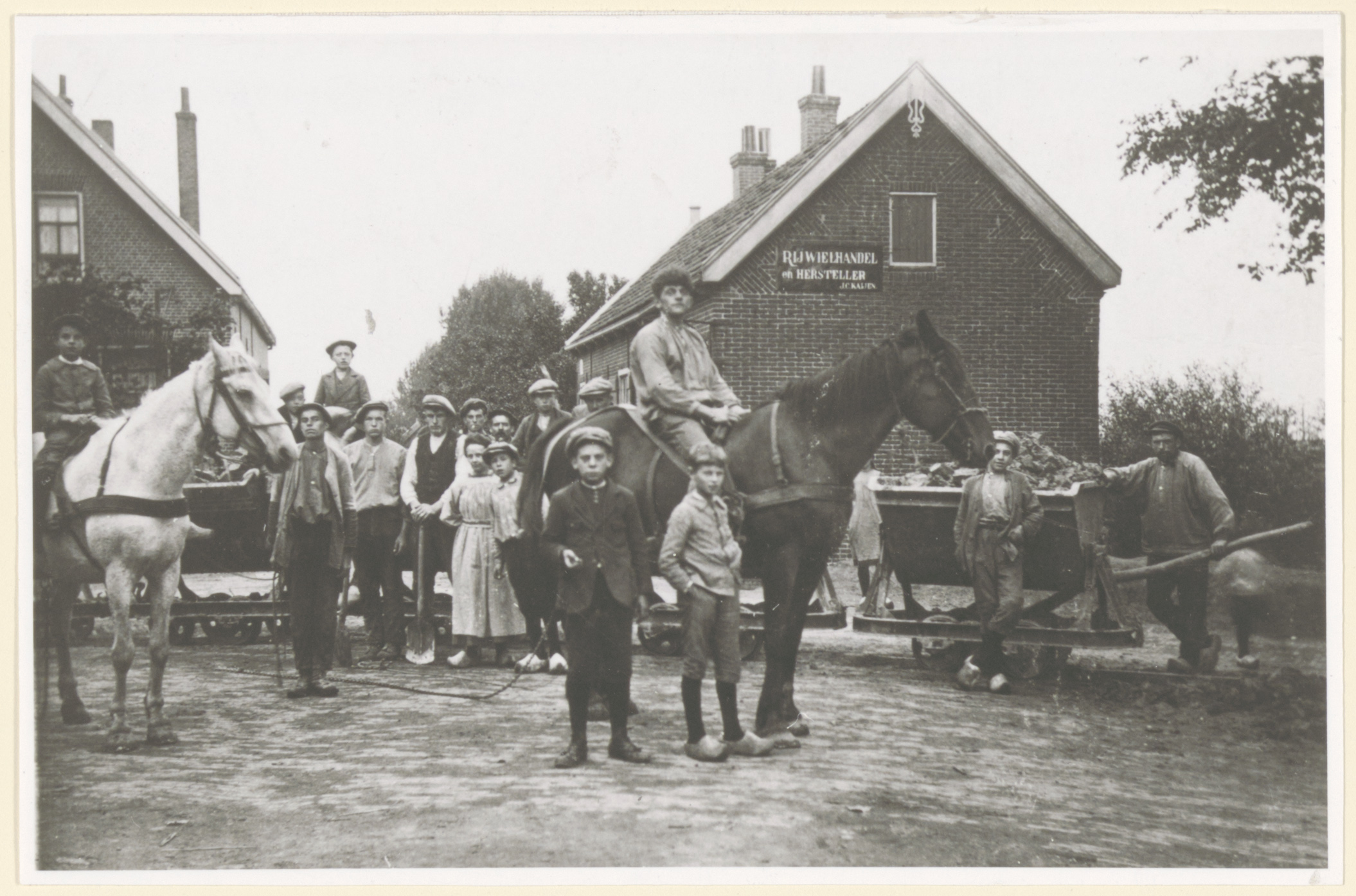 arbeiders / werklieden fietsenhandels / rijwielhandels groepsportretten paarden
