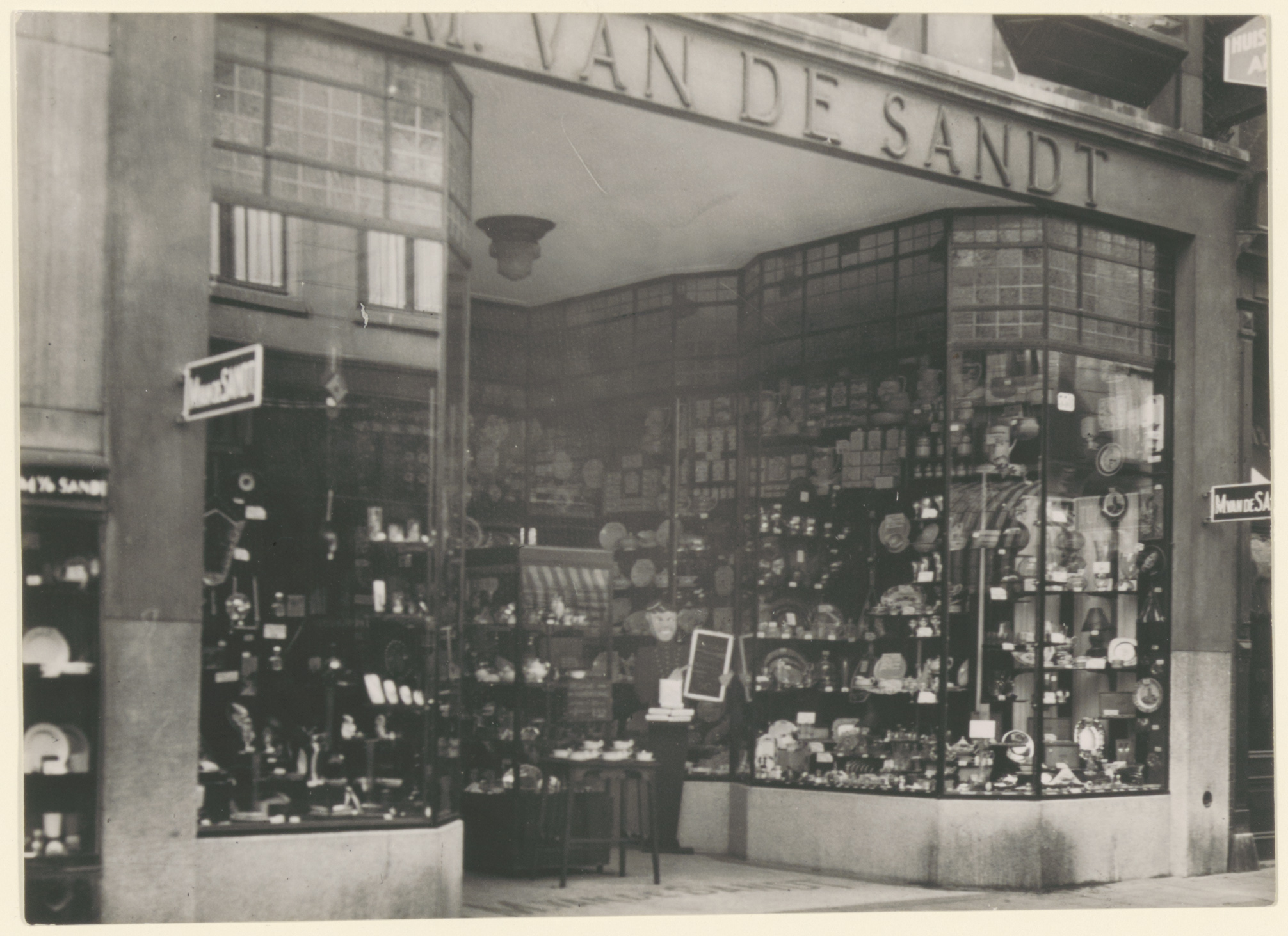 Etalage van de winkel in huishoudelijke artikelen (porselein, kristal, tafelzilver en luxe-artikelen) van M. van de Sandt aan de Voorstraat 358 (oud nr.).
