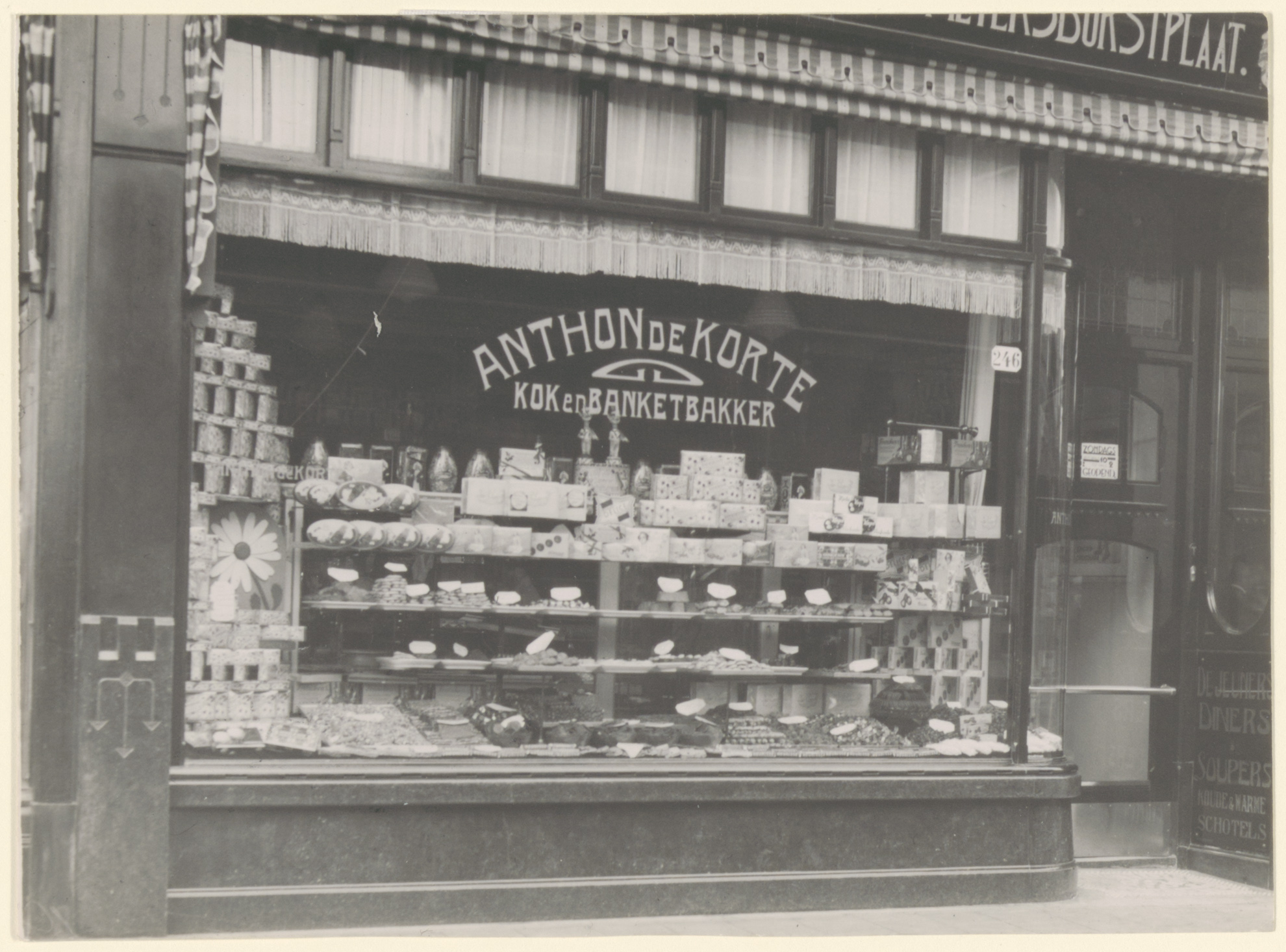 Etalage van banketbakker (tevens kok) Anthon de Korte aan de Voorstraat 246 (oud nr.).