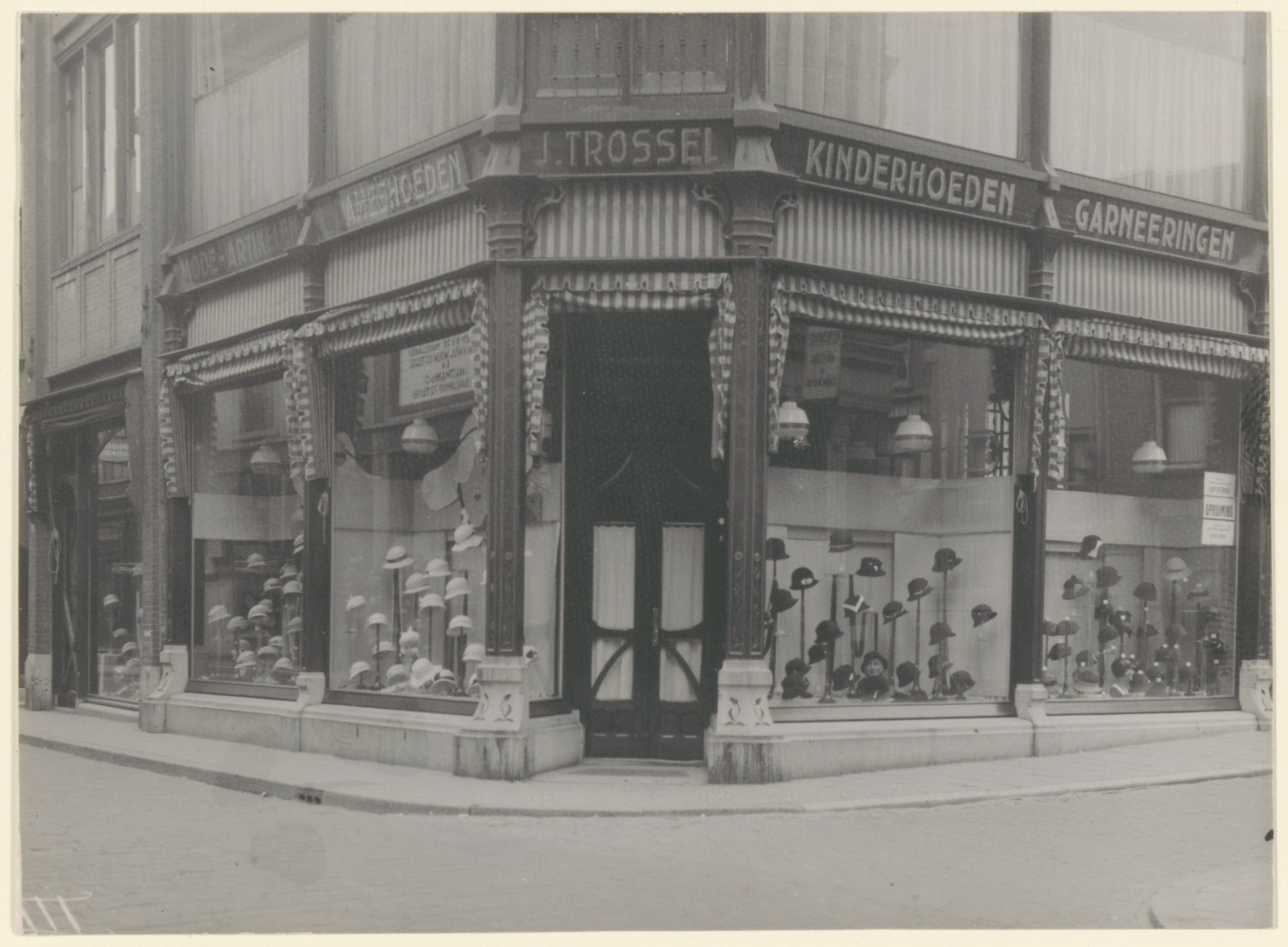 Etalages van Grootst Speciaal Dameshoedenmagazijn J. Trossel aan de Voorstraat 375/377 op de hoek van de Pelserbrug (rechts).