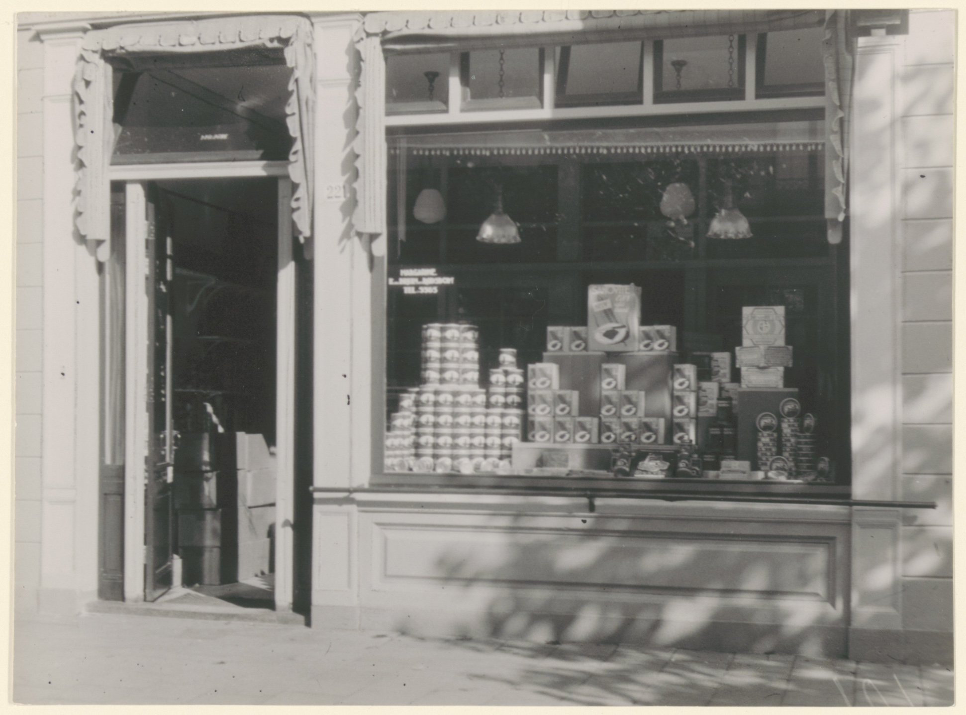 - Etalage van de winkel in zuivelproducten en comestibles van De Bruin & Roosdom aan de Albert Cuypsingel nr. 221 (oud nr.) rechts naast de doorgang naar de Muys van Holystraat.