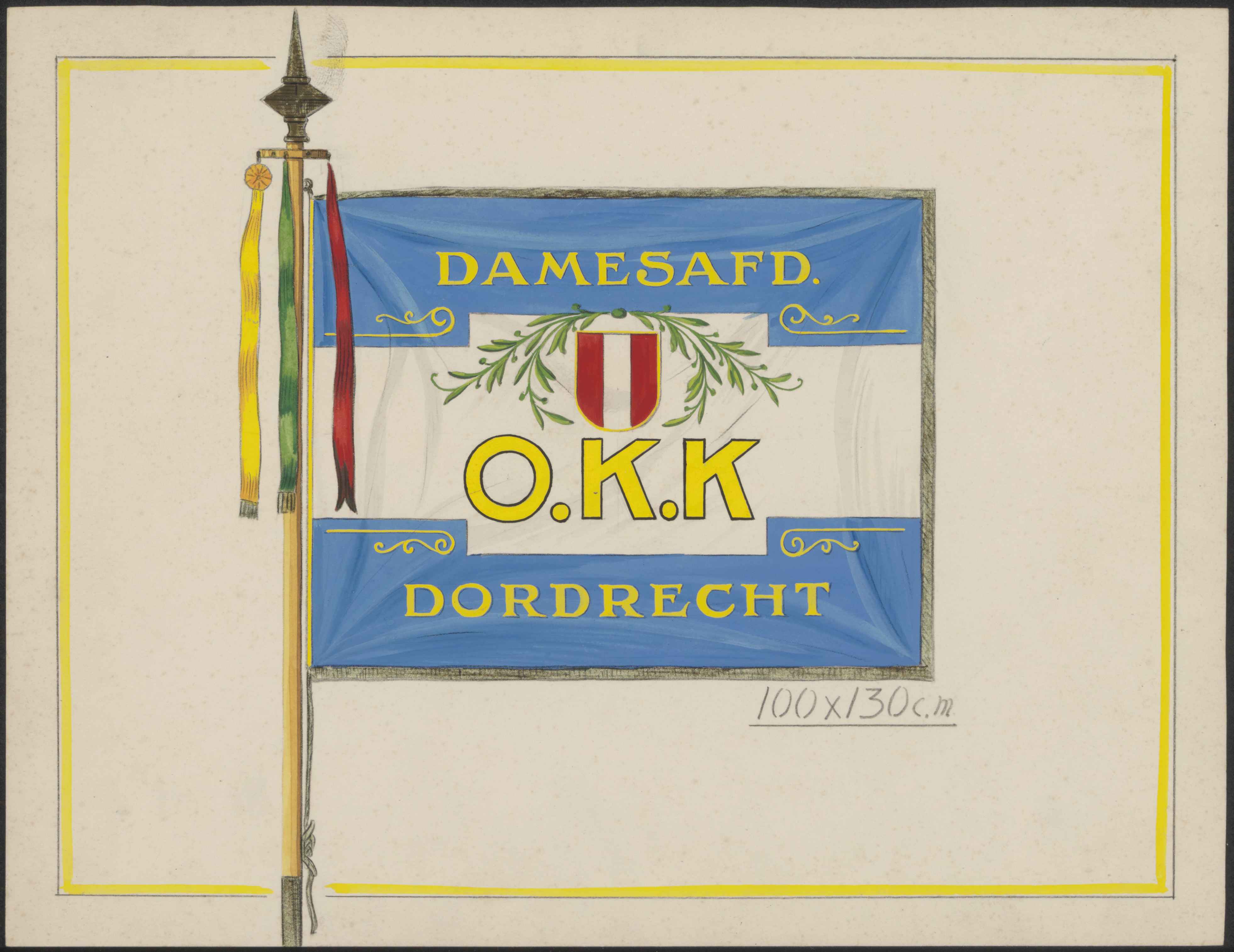 - Een vlag met stok van de dames afdeling van O.K.K. (Oefening Kost Kracht), of (Oefening Kweekt Kracht), Dordrecht.