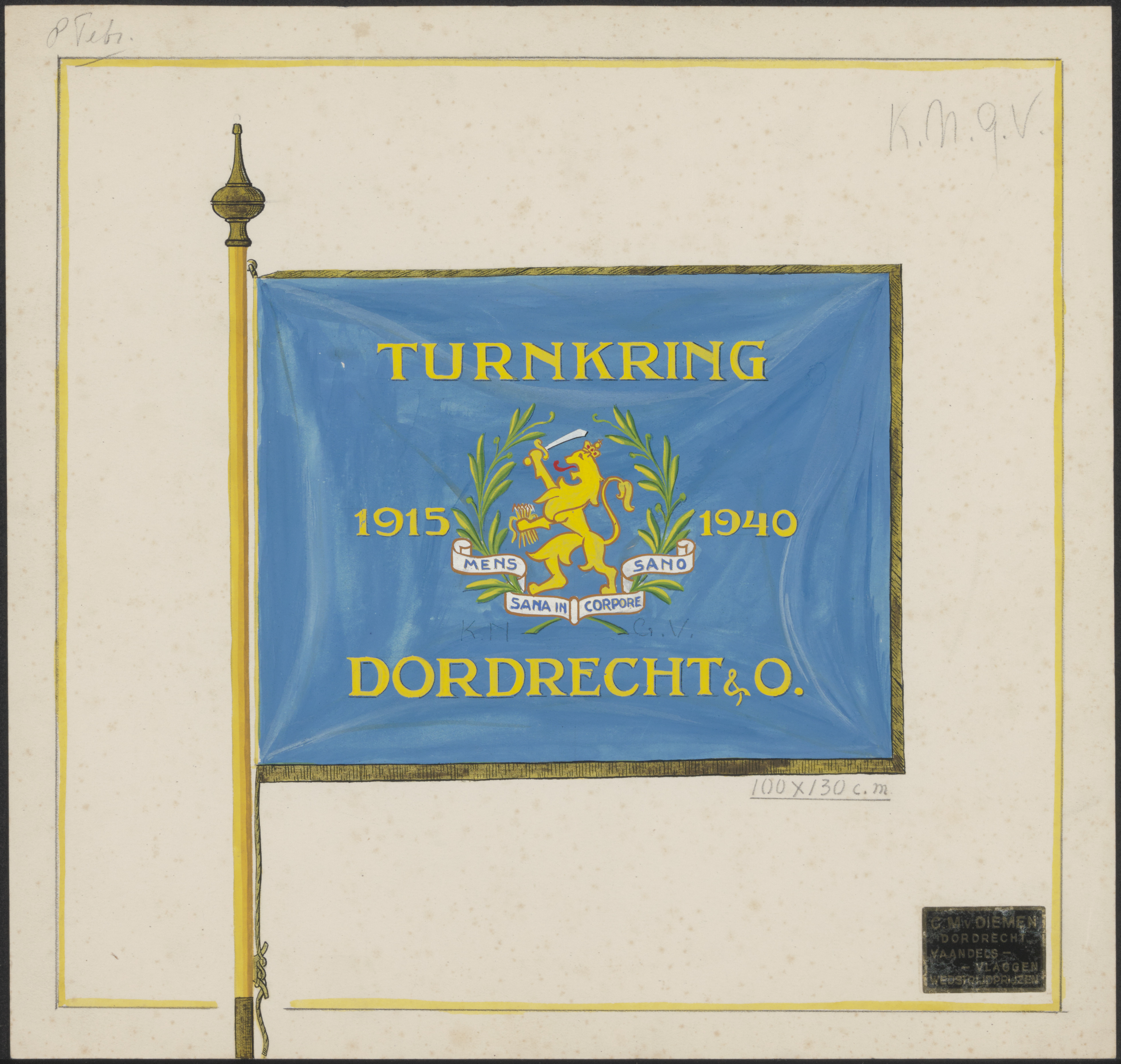 - Een vlag met stok van de Turnkring Dordrecht en Omstreken; met het opschrift: 'mens sana in corpore sano' (1940); opgericht in 1915.