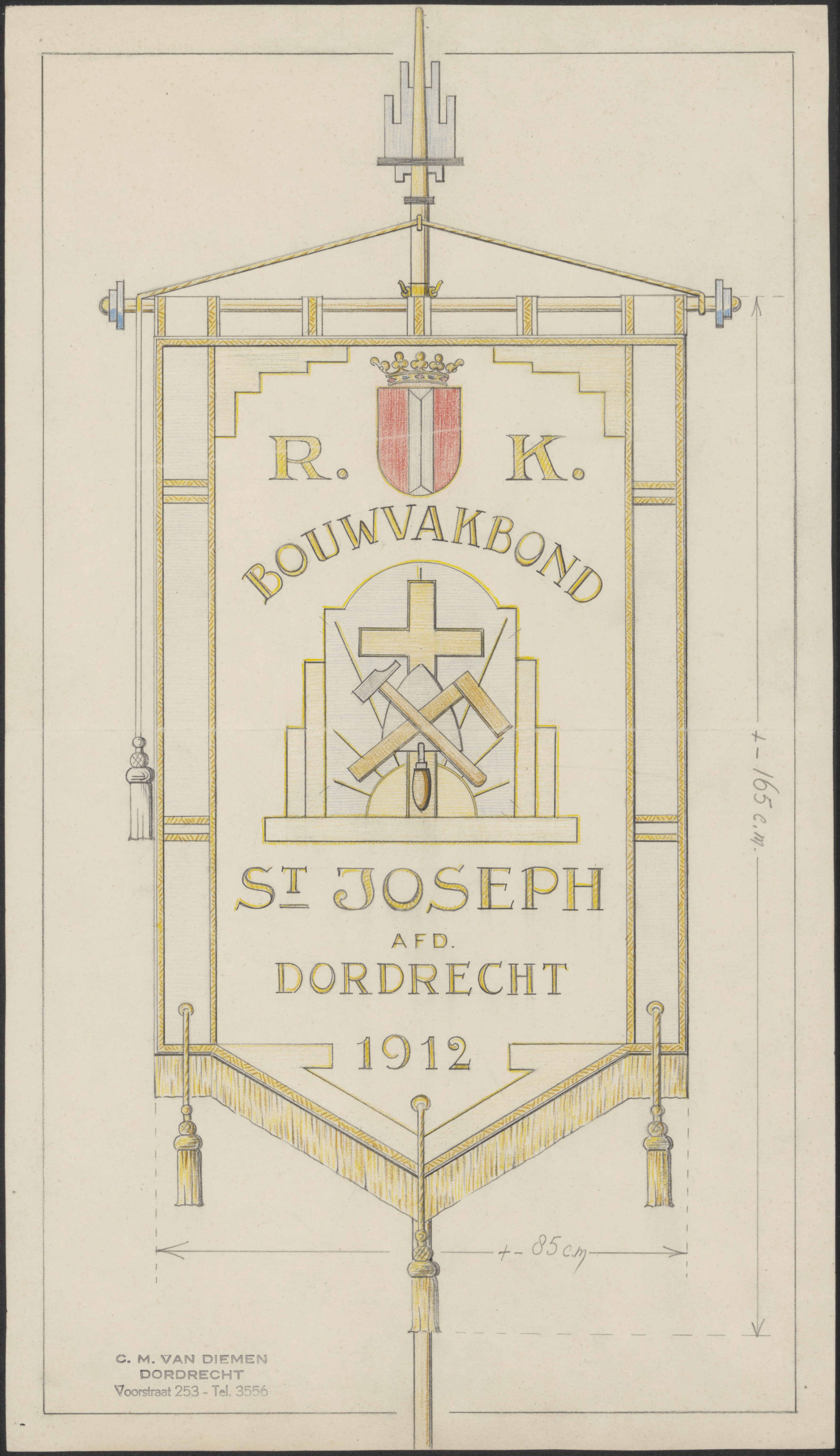 - Een kleurpotloodtekening van een vaandel van de RK-bouwvakbond 'St-Joseph', afd. Dordrecht, opgericht in 1912.