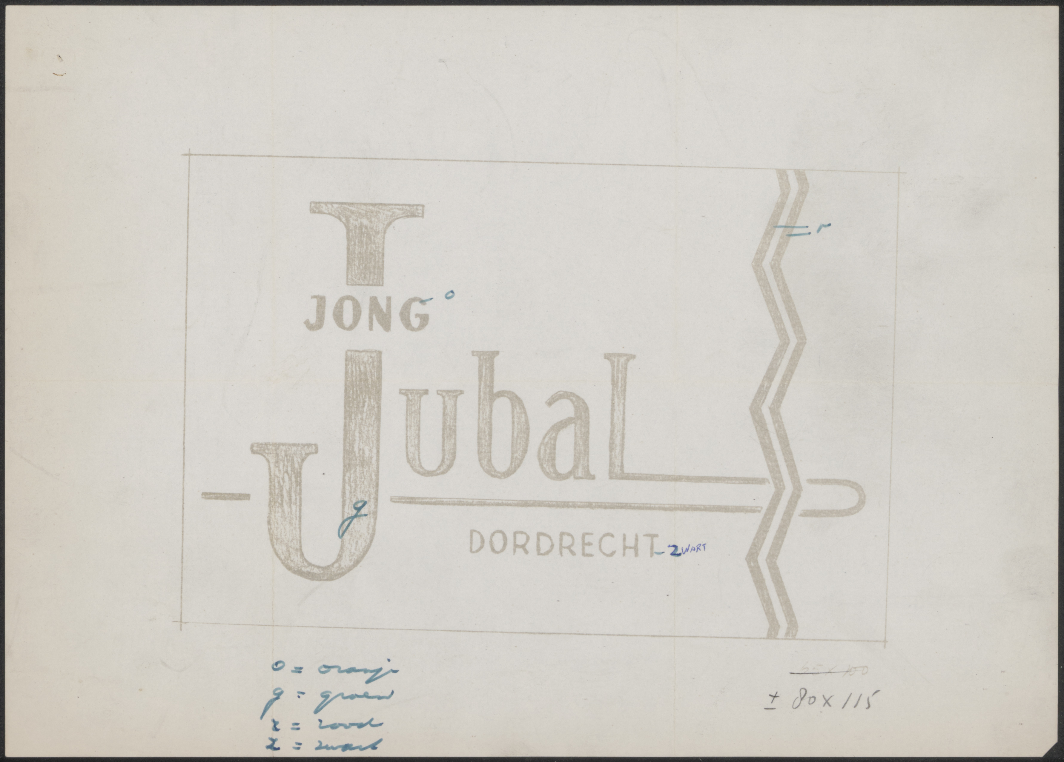 - Een potloodtekening van een vlag van 'Jong Jubal' te Dordrecht.