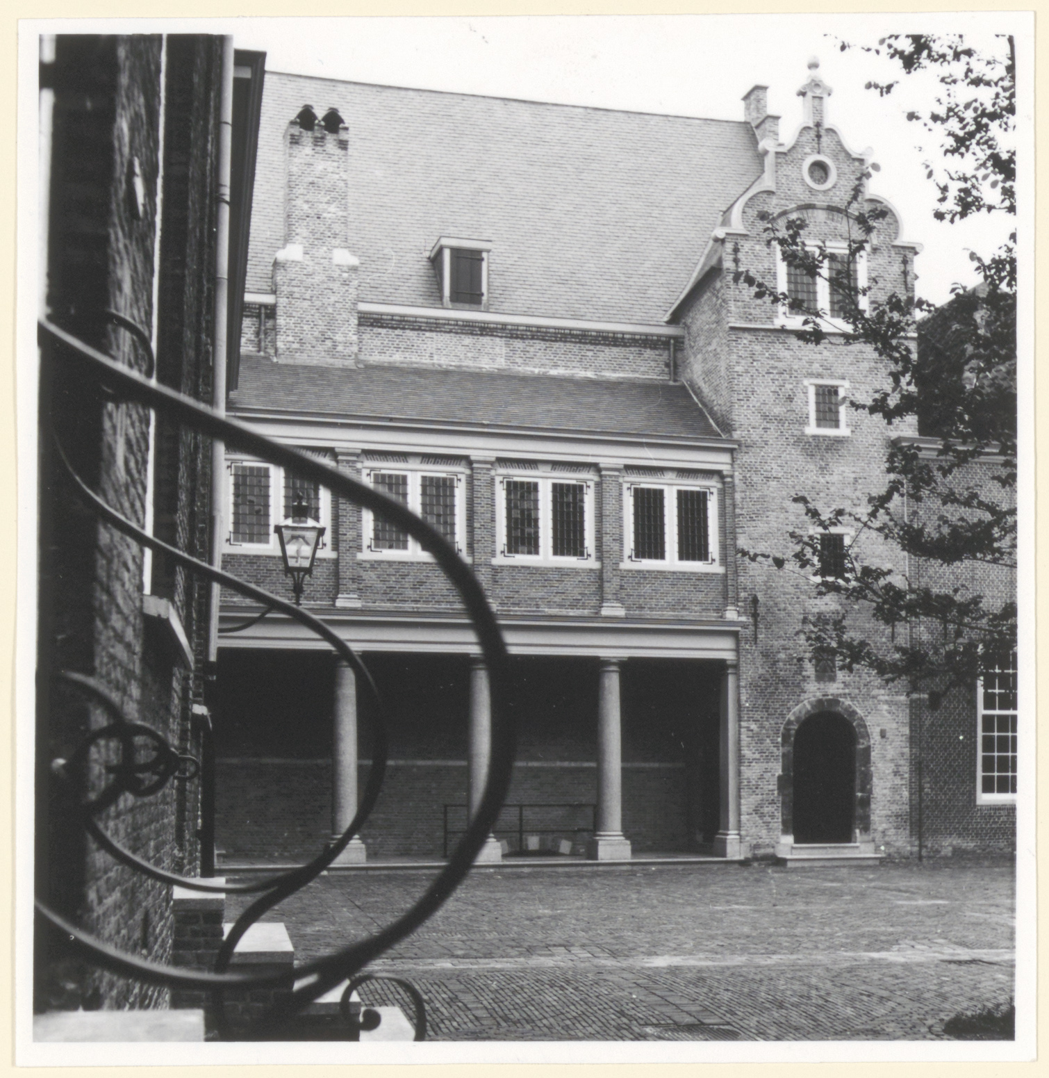 - De noordoostelijke hoek van de binnenzijde van het Hof met de ingang tot de Statenzaal en de zuilengalerij.