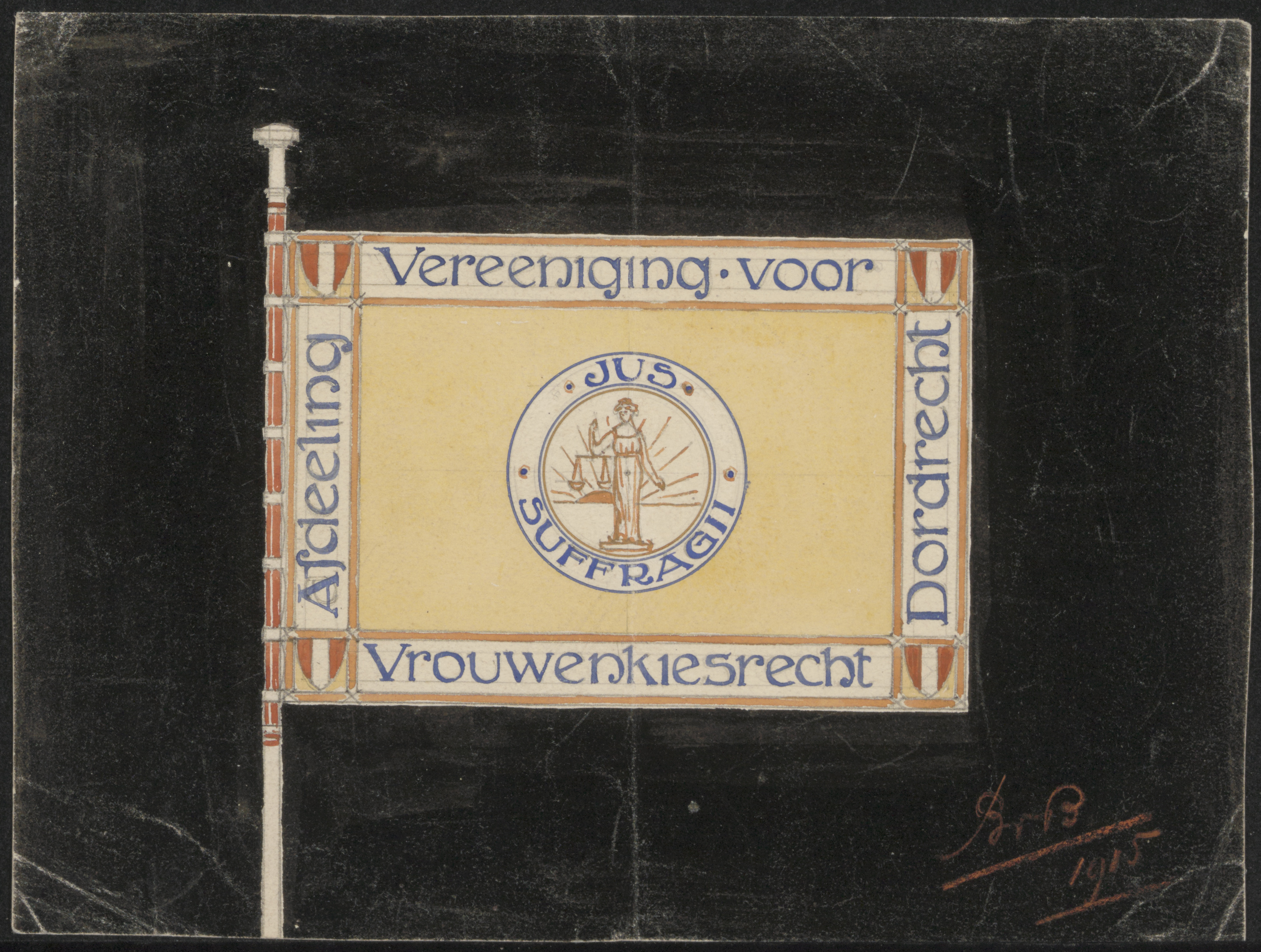 - Een vlag met stok van de Vereniging voor Vrouwenkiesrecht, afdeling Dordrecht, 1915.