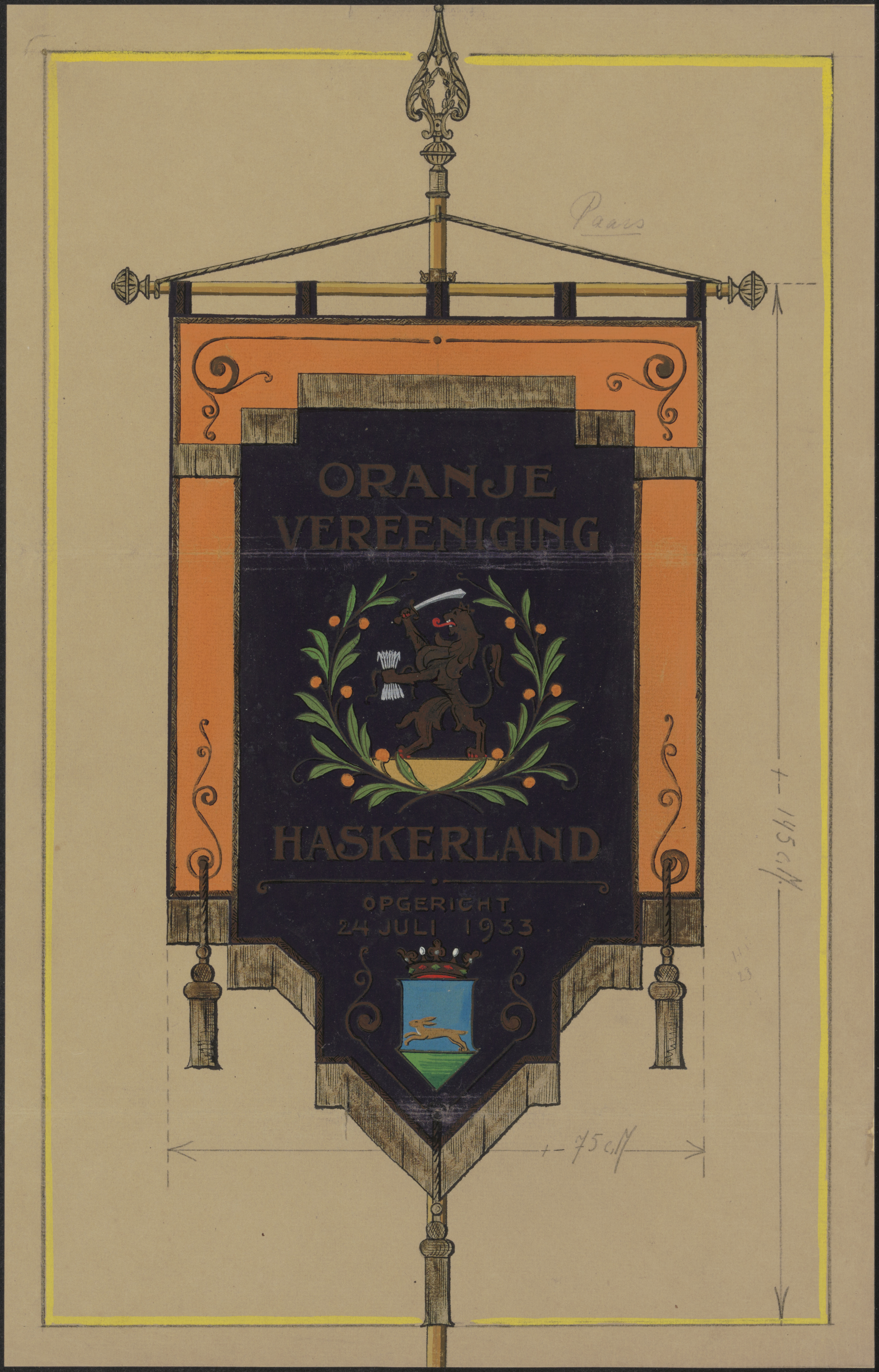 - Een vaandel van de Oranjevereeniging 'Haskerland', opgericht 24 juli 1933.