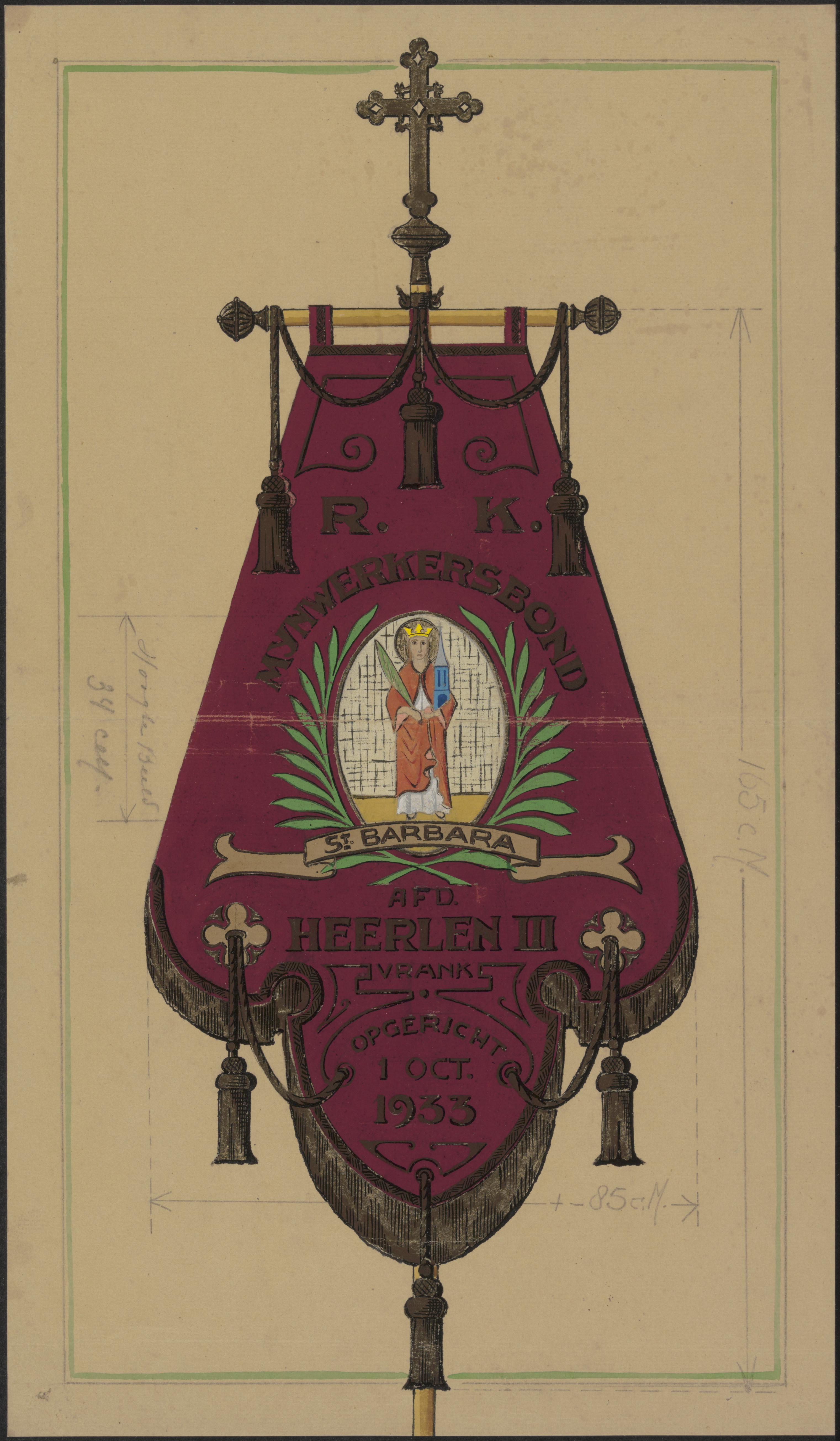 - Een vaandel van de R.K. Mijnwerkersbond 'St. Barbara', afd. Heerlen III (vrank); opgericht 1 oktober 1933.