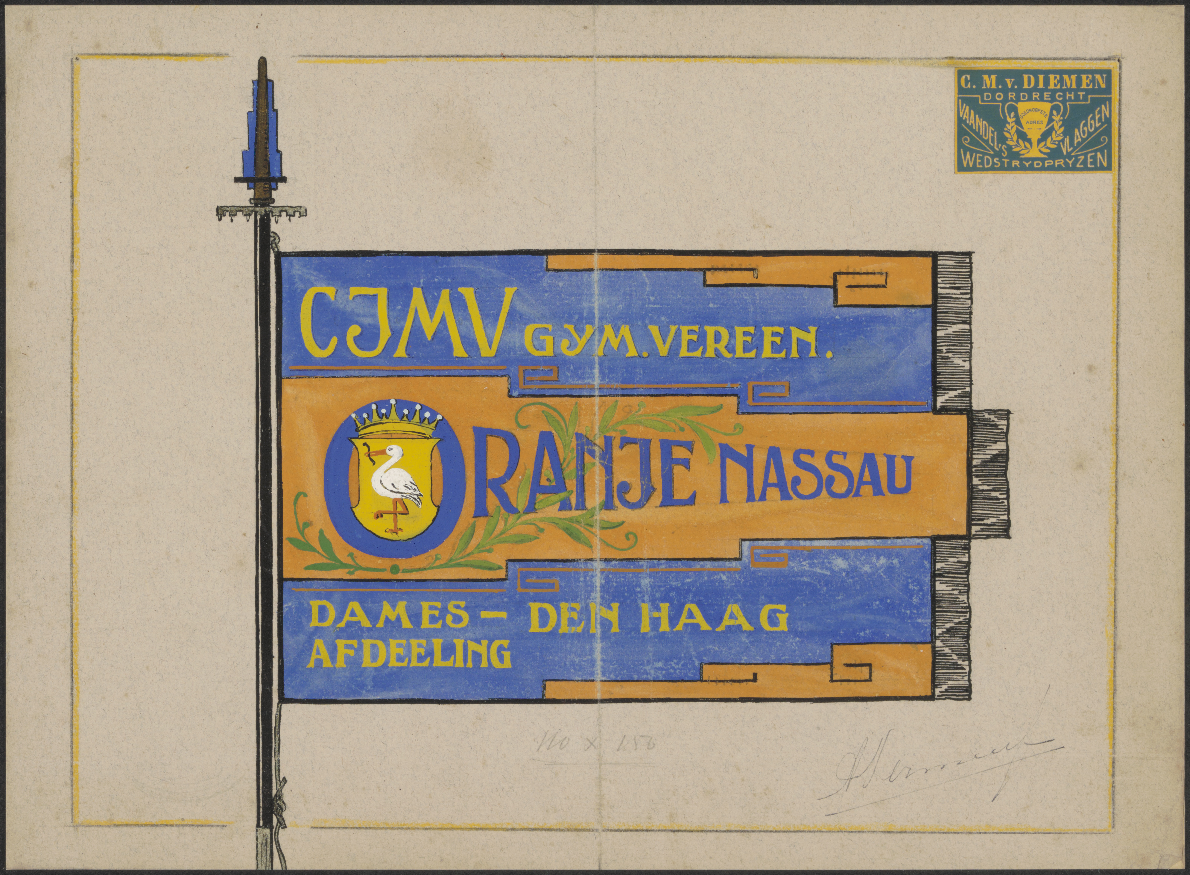 - Een vlag van de C.J.M.V. Gymnastiek Vereeniging 'Oranje-Nassau'; damesafd.: Den Haag.