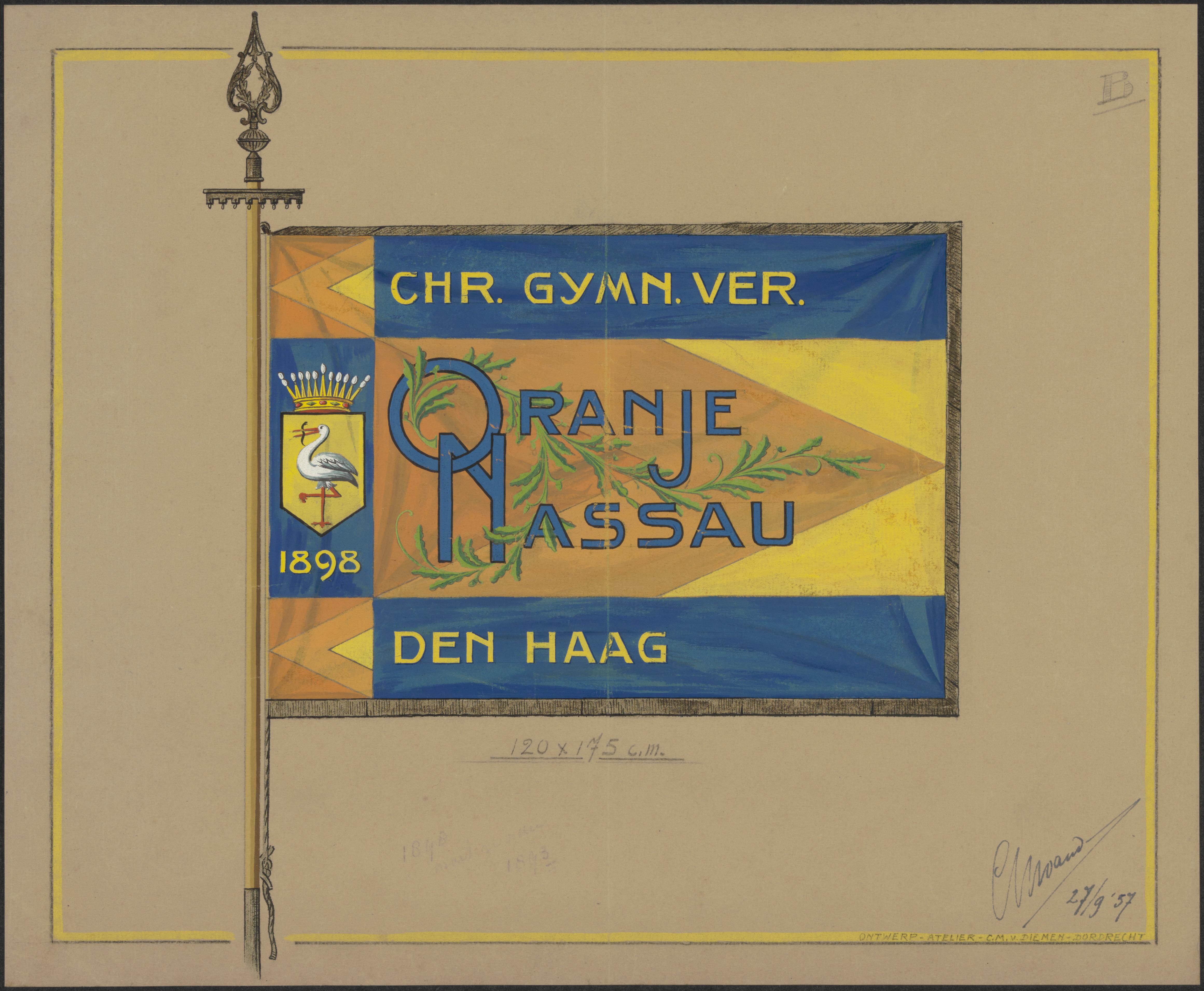 Een vlag van de Chr. Gymnastiek Vereniging 'Oranje Nassau' - Den Haag; 1898.