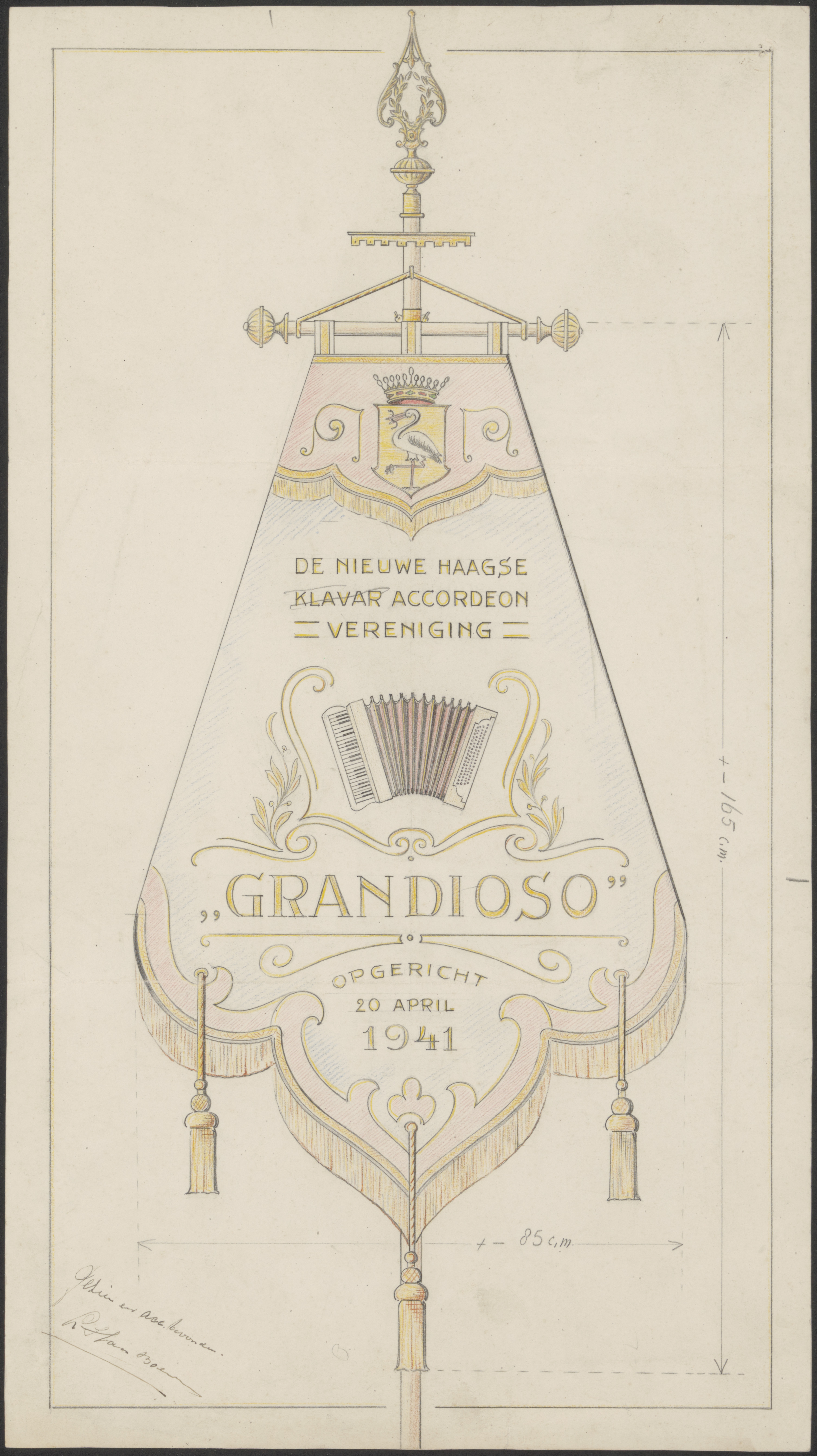 - Een vaandel van de 'Nieuwe Haagse Klavar Accordeon Vereeniging 'Grandioso'; opgericht 20 april 1941.