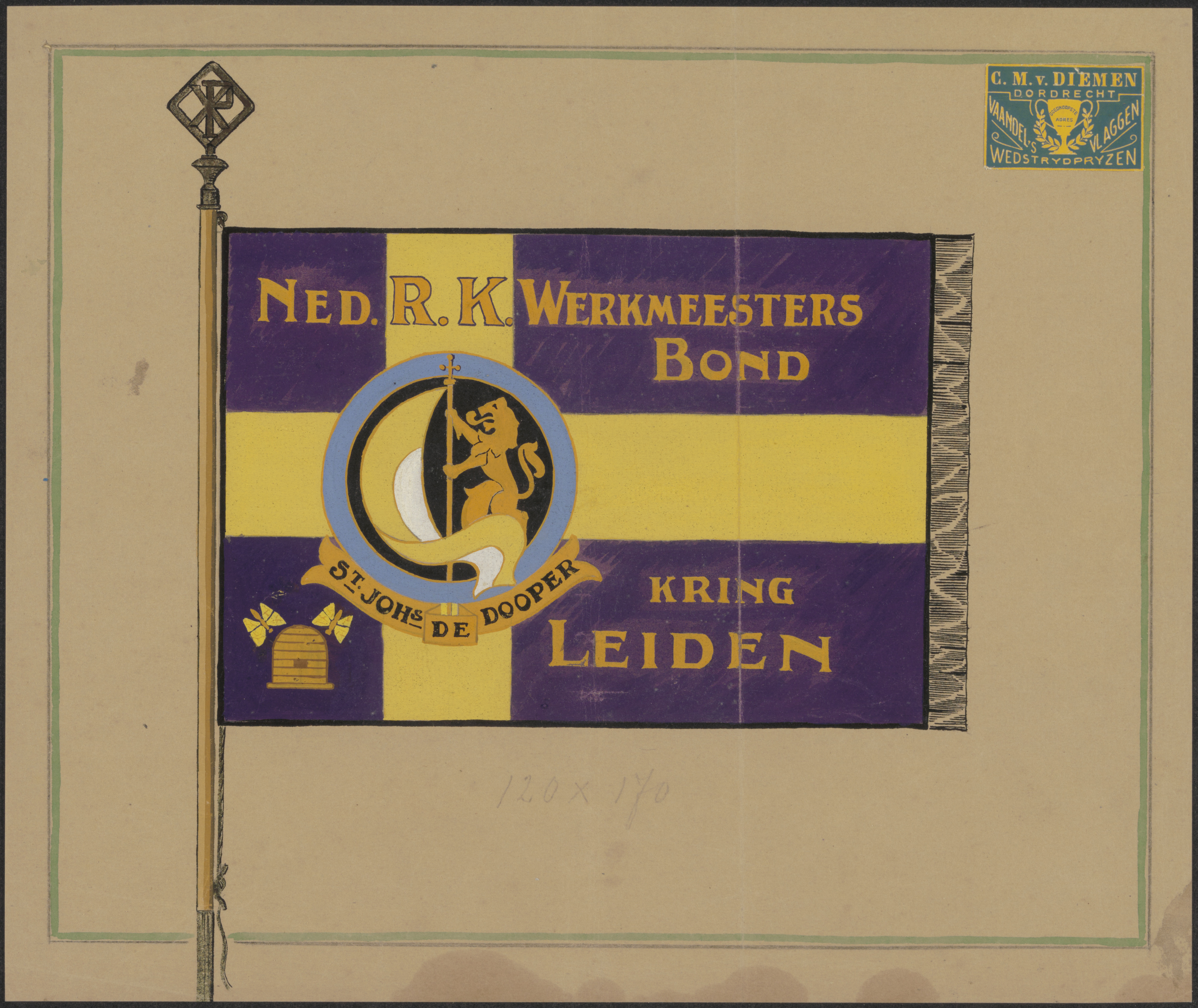 - Een vlag van de Nederlandse R.K. Werkmeestersbond 'St. Johannes de Dooper' (Kring Leiden).