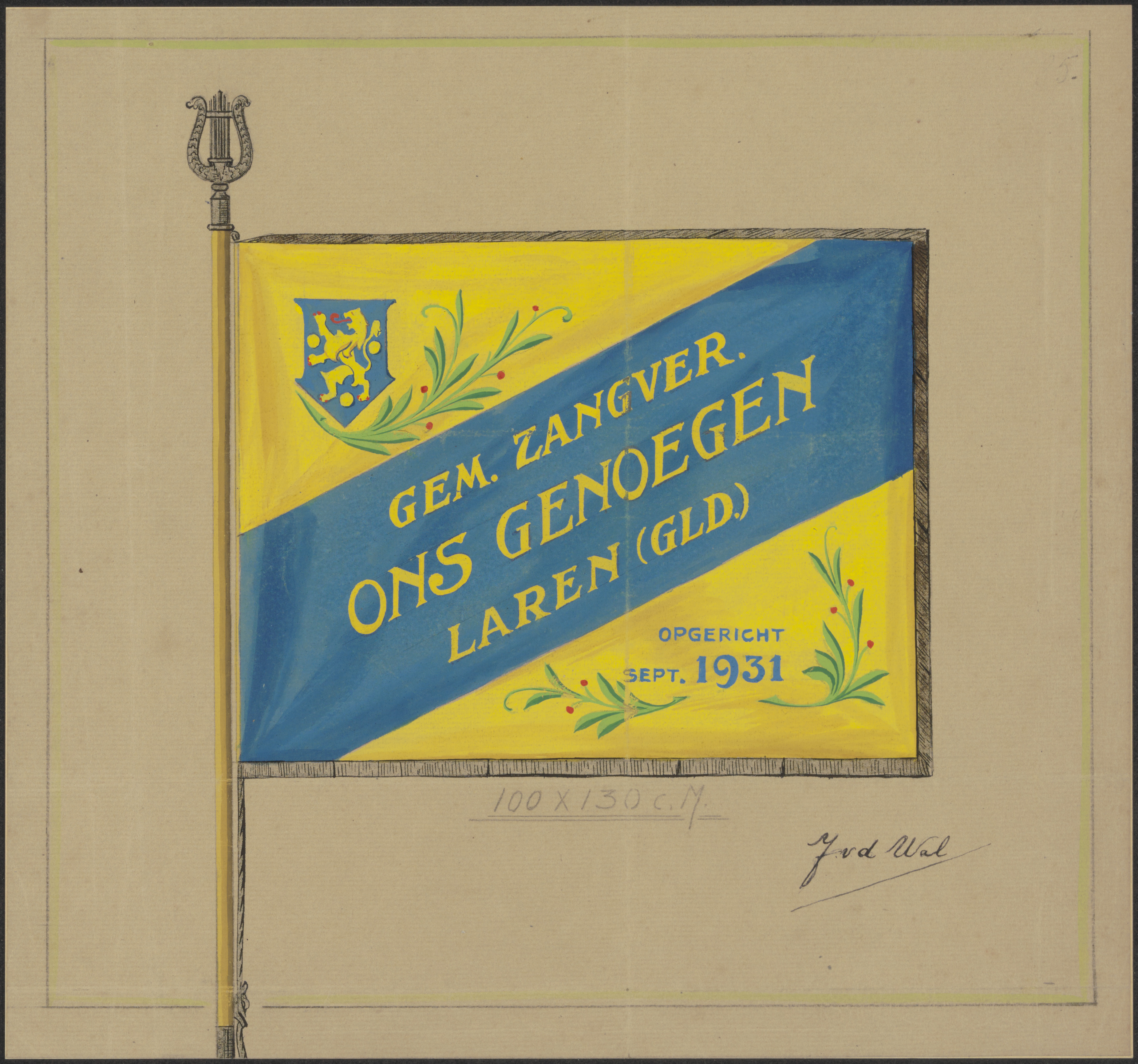 - Een vlag vande Gemeentelijke Zangvereniging 'Ons Genoegen' te Laren (Gld.); opgericht september 1931.