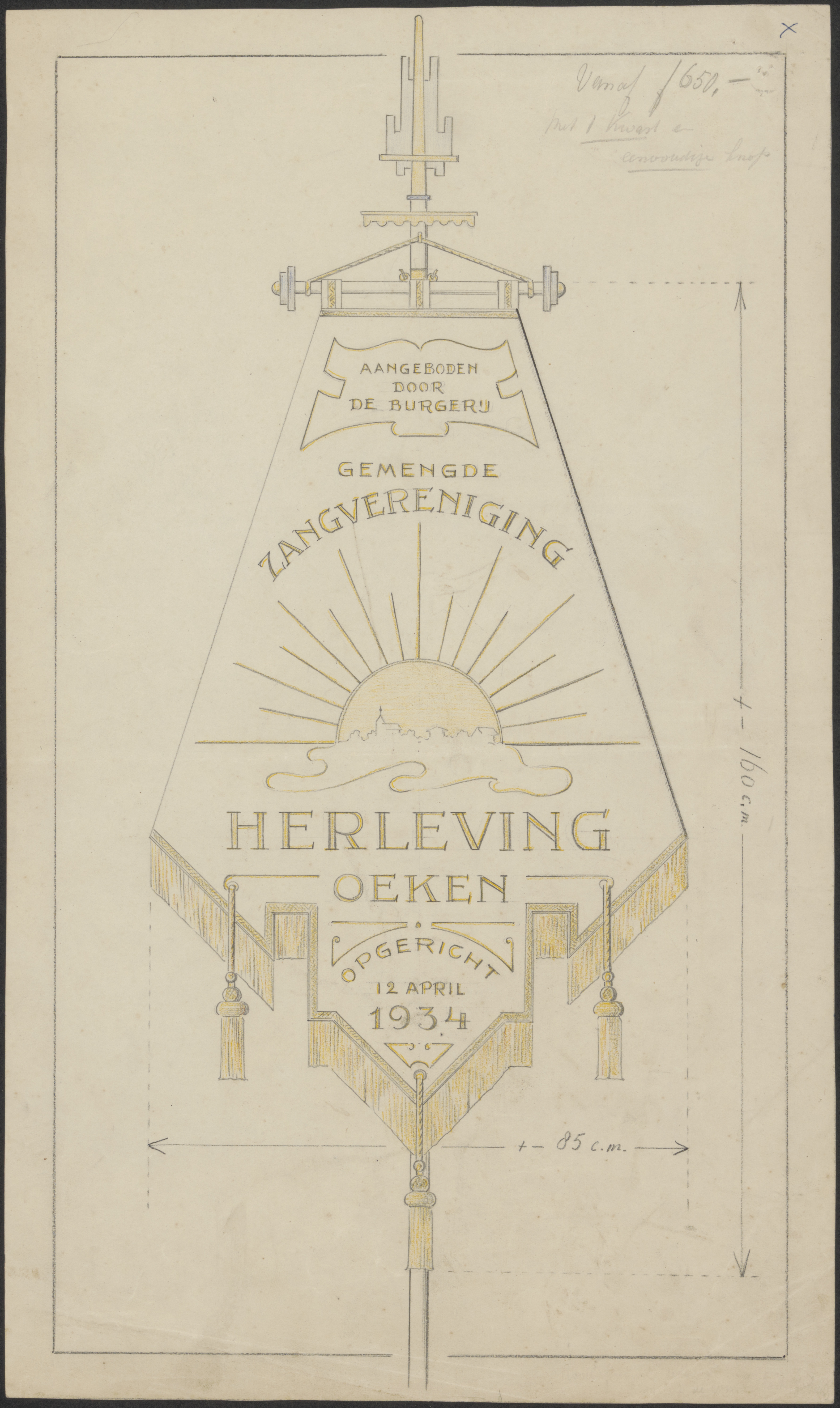 - Een vaandel van de Gem. Zangvereniging 'Herleving' te Oeken, (Gelderland) opgericht 12 april 1934, aangeboden door de burgerij.
