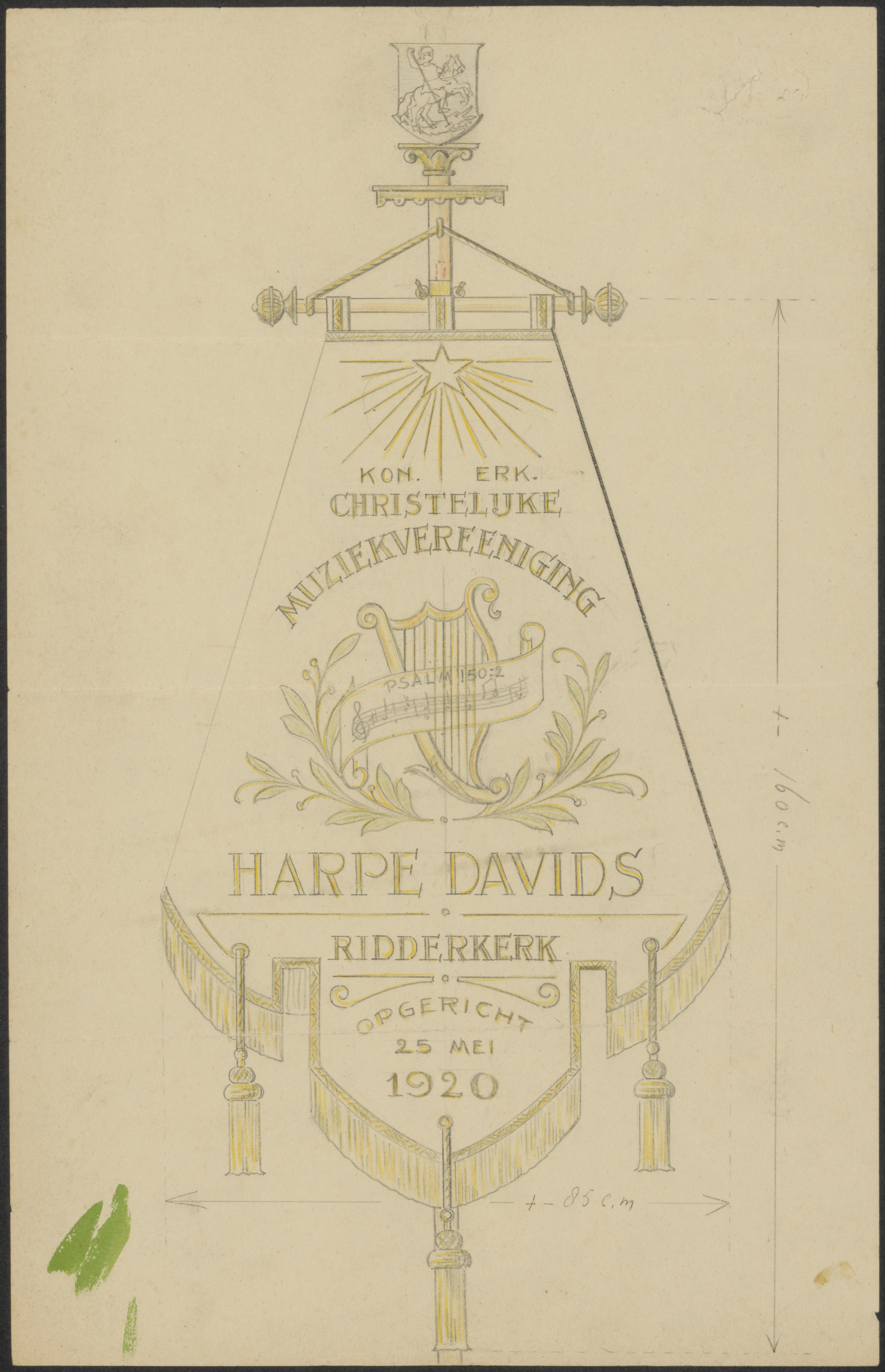 - Een vaandel van de Koninklijk Erkende Christelijke Muziekvereeniging 'Harpe Davids' te Ridderkerk, opgericht 25 mei 1920.