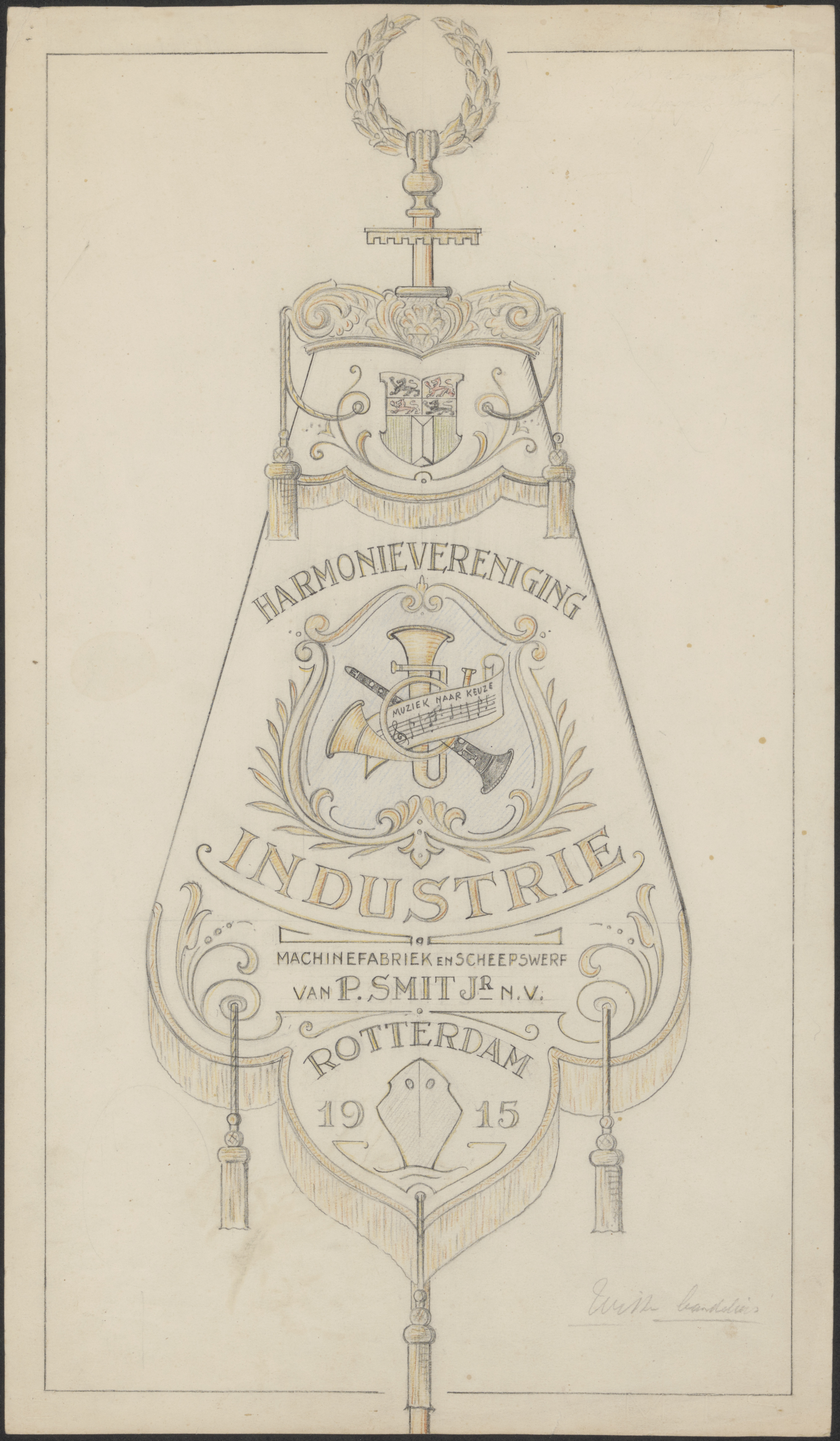 - Een vaandel van de Harmonie Vereeniging 'Industrie' Machinefabriek en Scheepswerf van P. Smit jr. N.V. te Rotterdam, 1915.