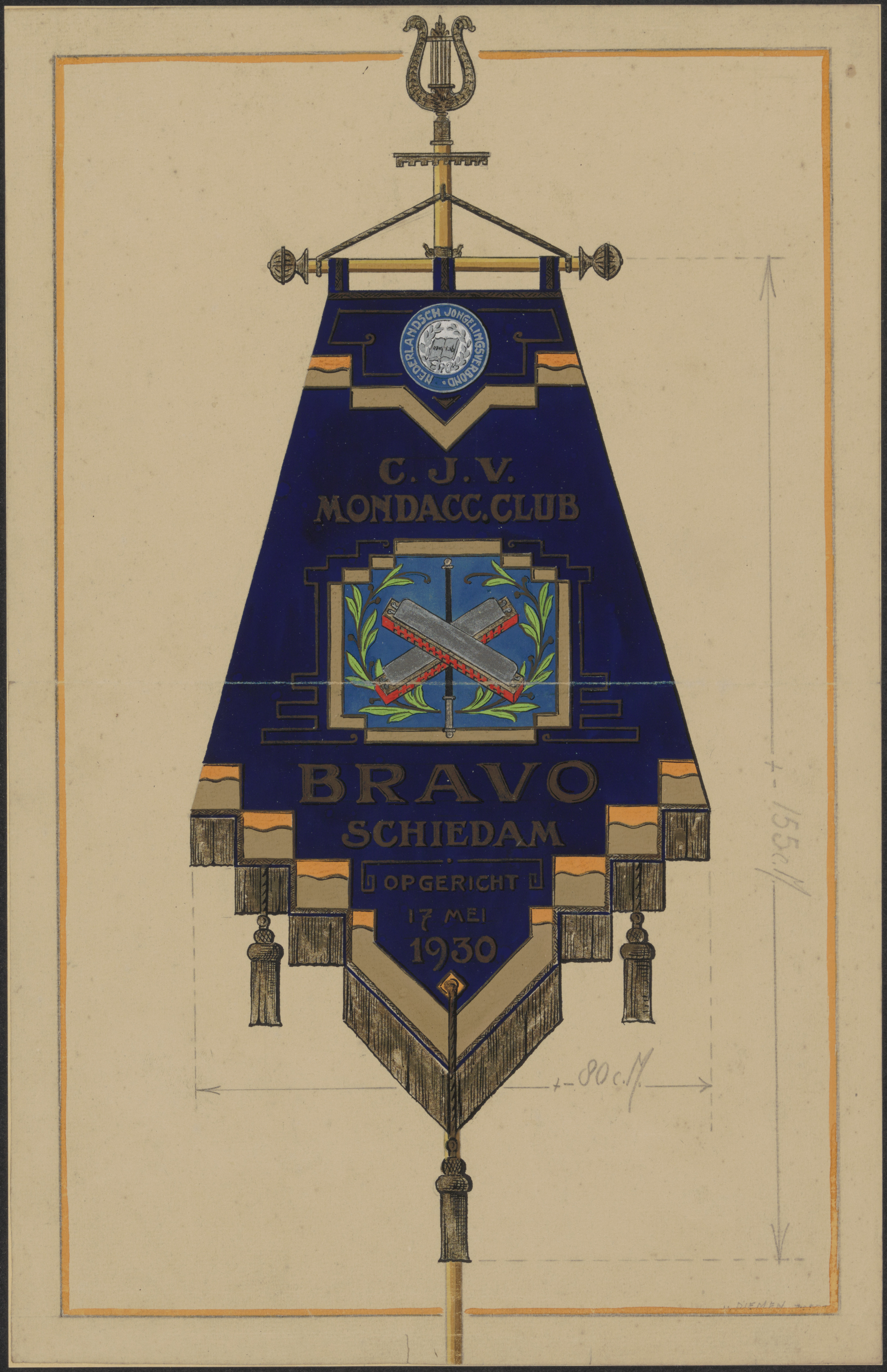 - Een vaandel van de C.J.V. Mondaccordeon-club 'Bravo' te Schiedam, opgericht 17 mei 1930.