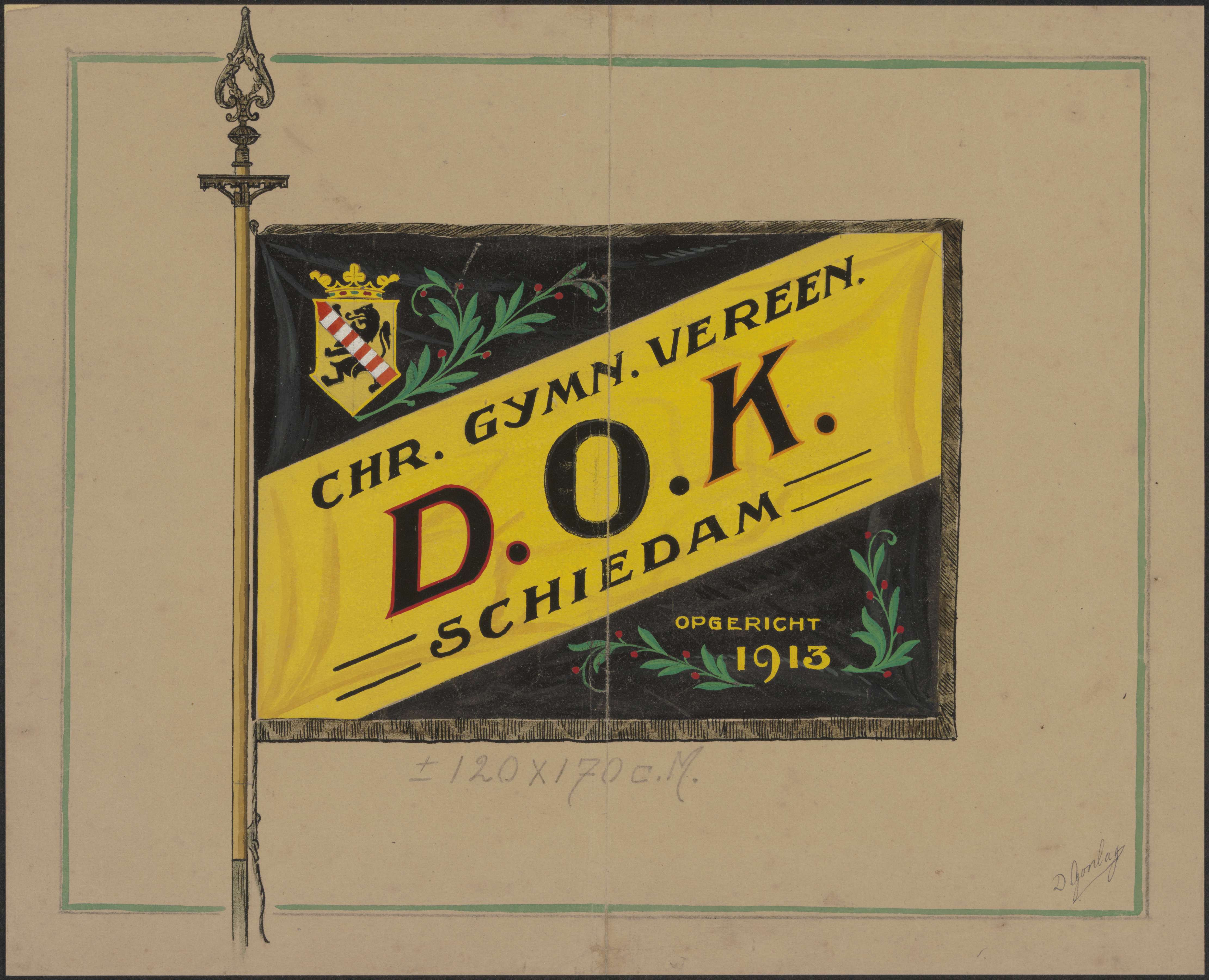 - Een vlag van de Christelijke Gymnastiekvereeniging D.O.K. te Schiedam, opgericht 1913.