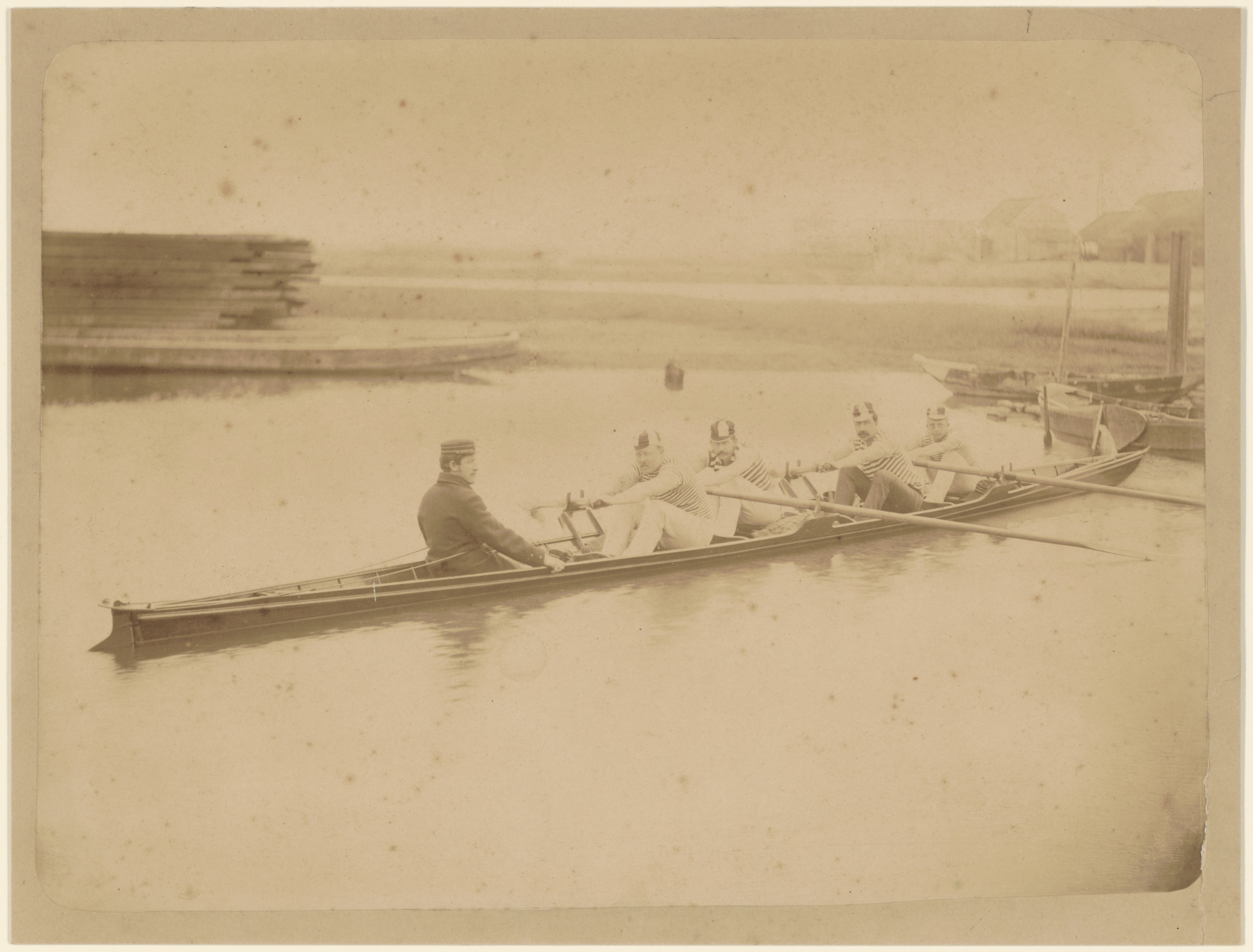 - Outrigger race giek in een balkengat aan de Noordendijk met 5 leden van de Koninklijke Dordrechtsche Roei- en Zeilvereniging. V.r.n.l. W. Reus, E. en G.H. Boonen, H.C. Nievervaart en stuurman F. van Brakel; de boot heet Amphitrite.
