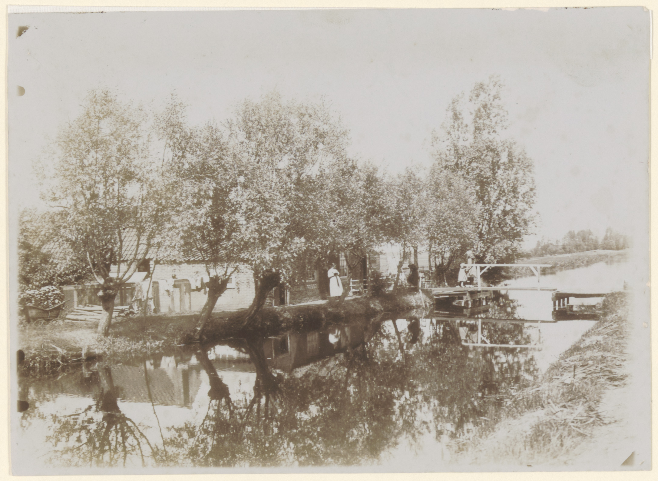 - Een boerderij en knotwilgen aan een vaart met een houten bruggetje, waarop twee kinderen.
