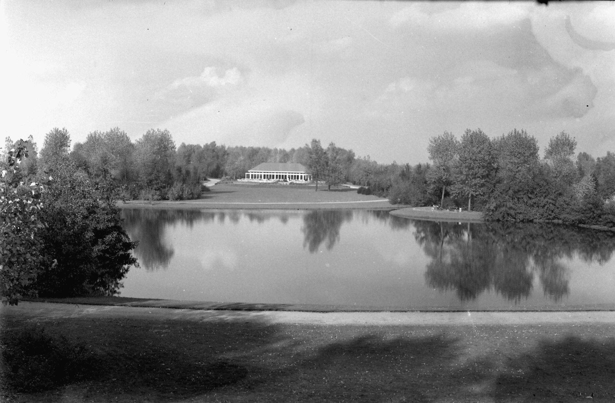 Vijver in het Wantijpark met uitzicht op het Wantijpaviljoen.