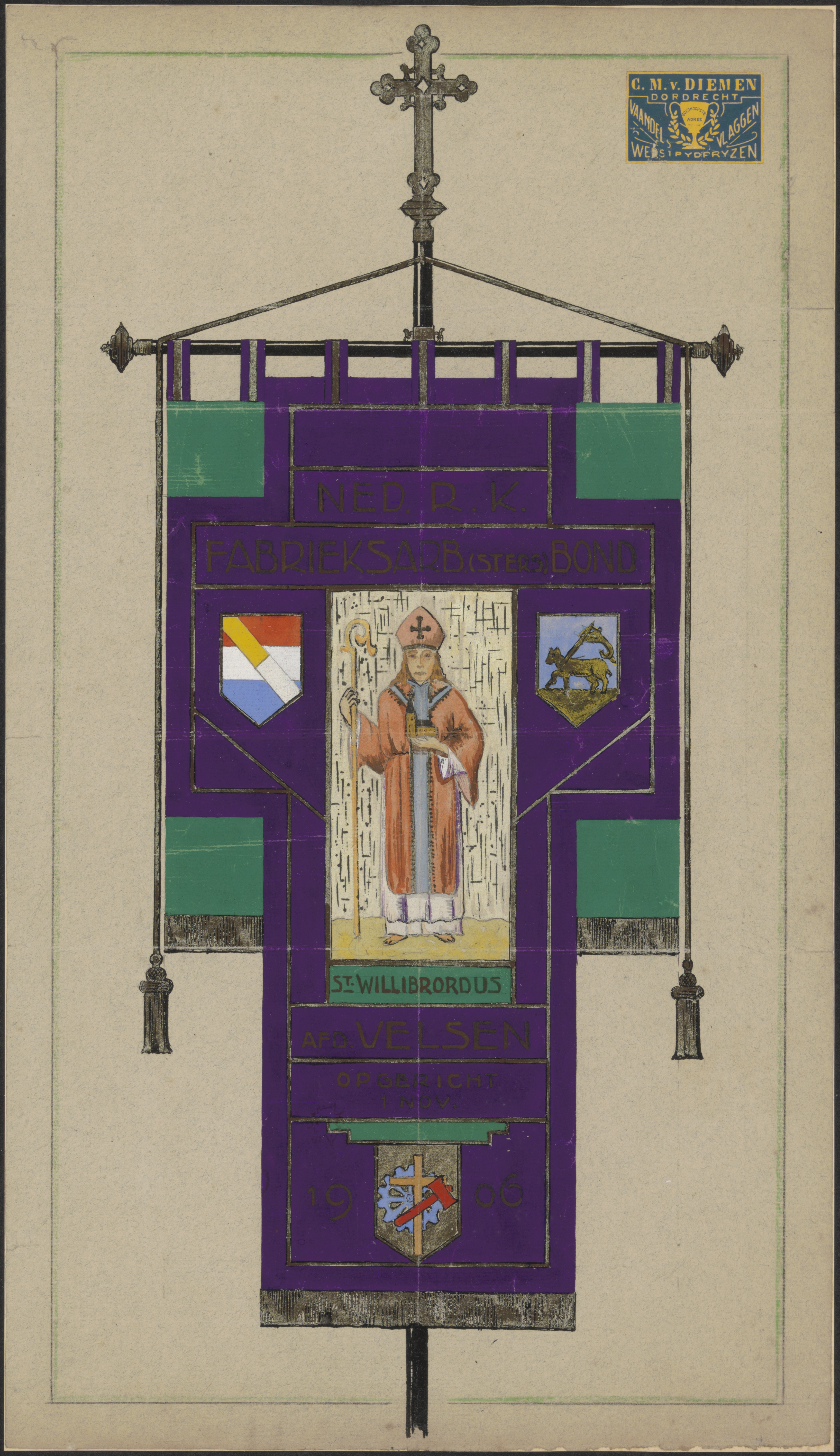 - Een vaandel van de Ned. R.K. fabrieksarbeiders(sters) bond St. Willibrordus afd. Velsen; opgericht 1 november 1906.