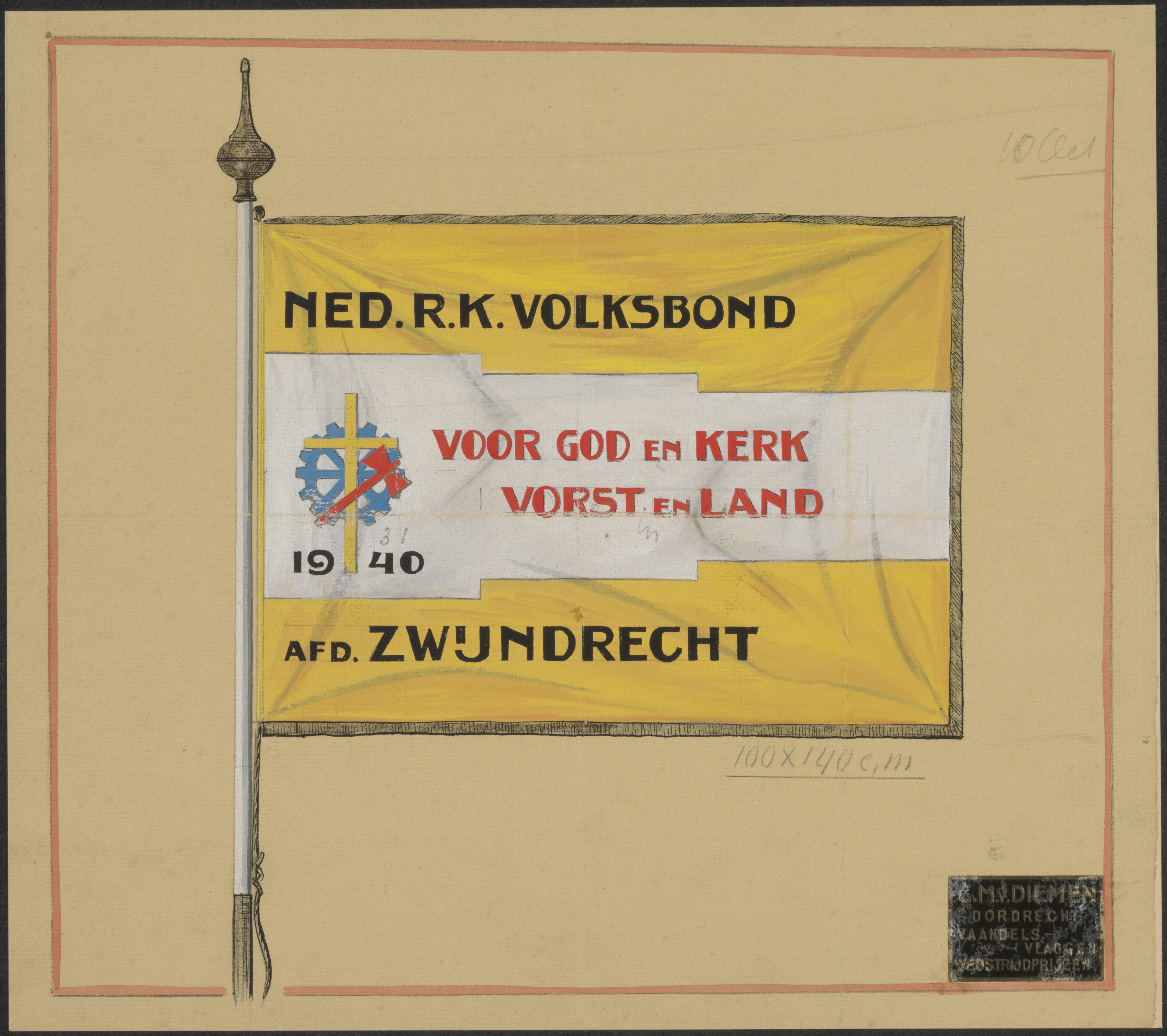 - Een vlag van de Nederlandse R.K. Volksbond 'Voor God en Kerk, Vorst en Land' afd. Zwijndrecht (1940).