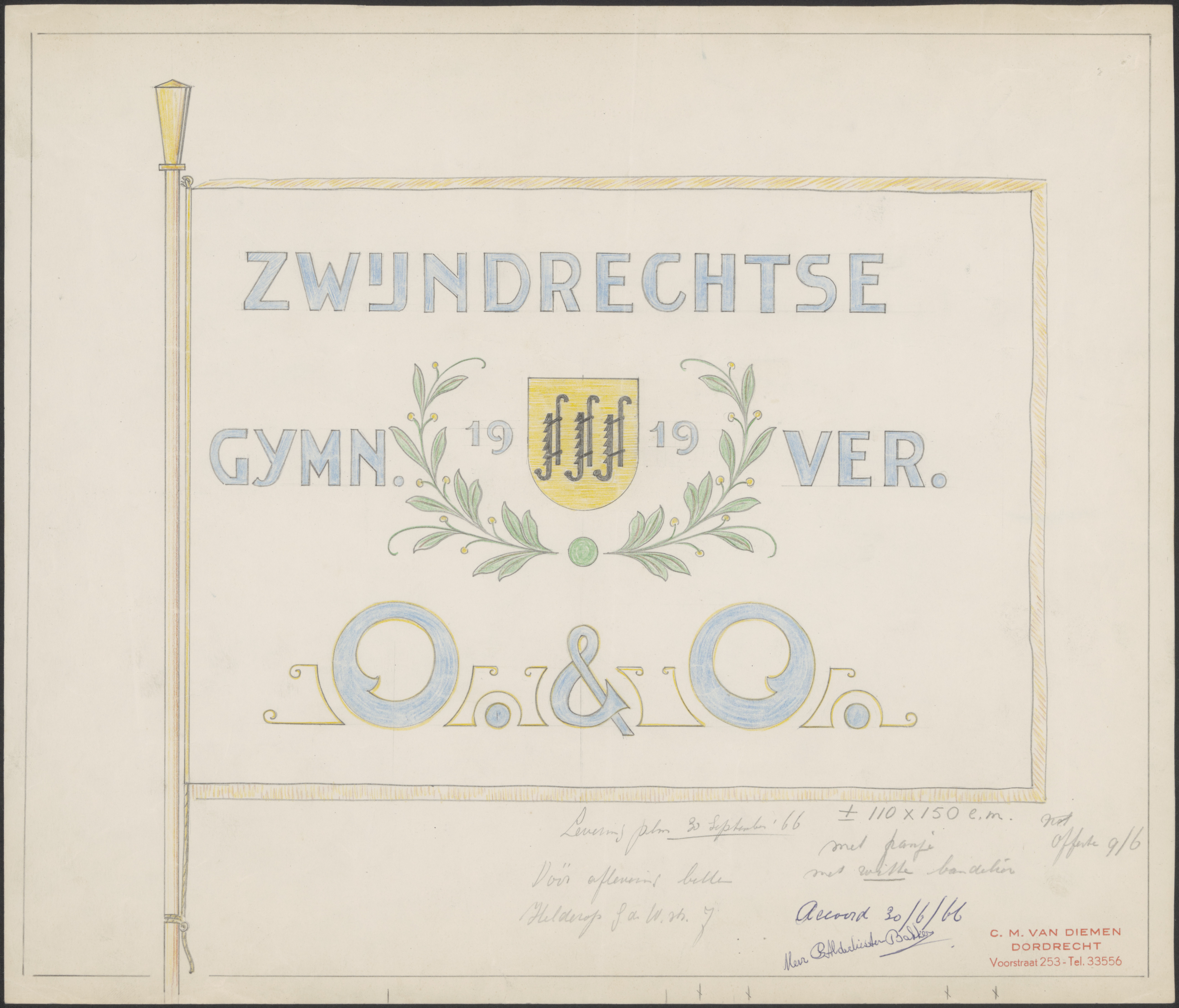 - Een vlag van de Gymnastiek Vereniging O. en O. te Zwijndrecht (1919).