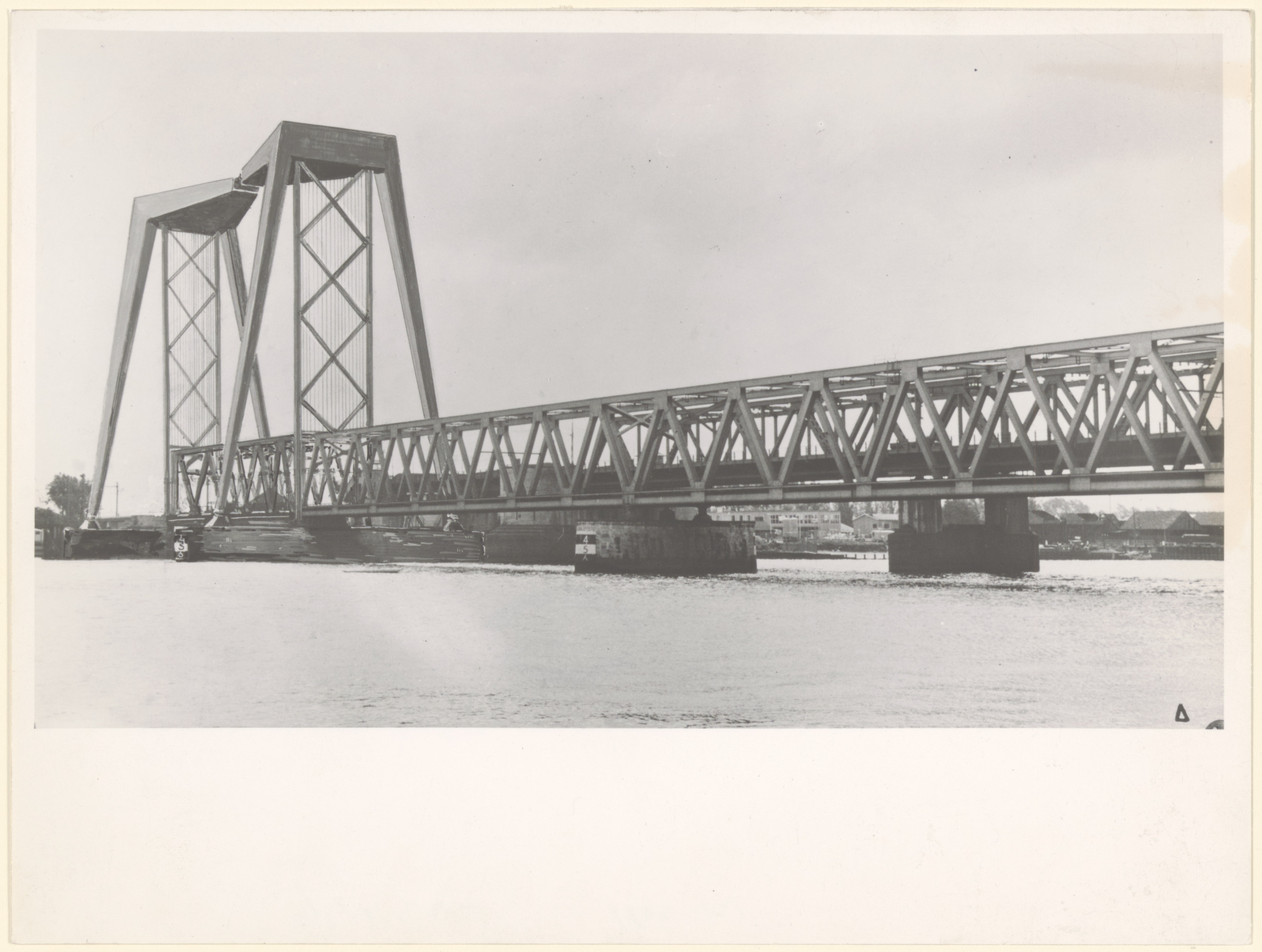 De spoorbrug over de Oude Maas, gezien vanaf de Zwijndrechtse oever naar het zuiden. Dit is een montagefoto waarop links de nog te bouwen heftoren is ingetekend.