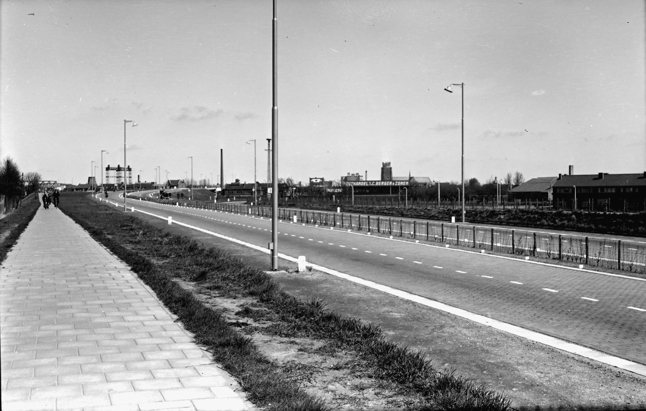- Rijksweg naar het noorden gezien. Op de achtergrond de romp van molen De Pelikaan en de heftoren van de Dokbrug. Achter houthandel Berger de silhouetten van de EMF- en Victoria-fabriek en de Grote Kerk.