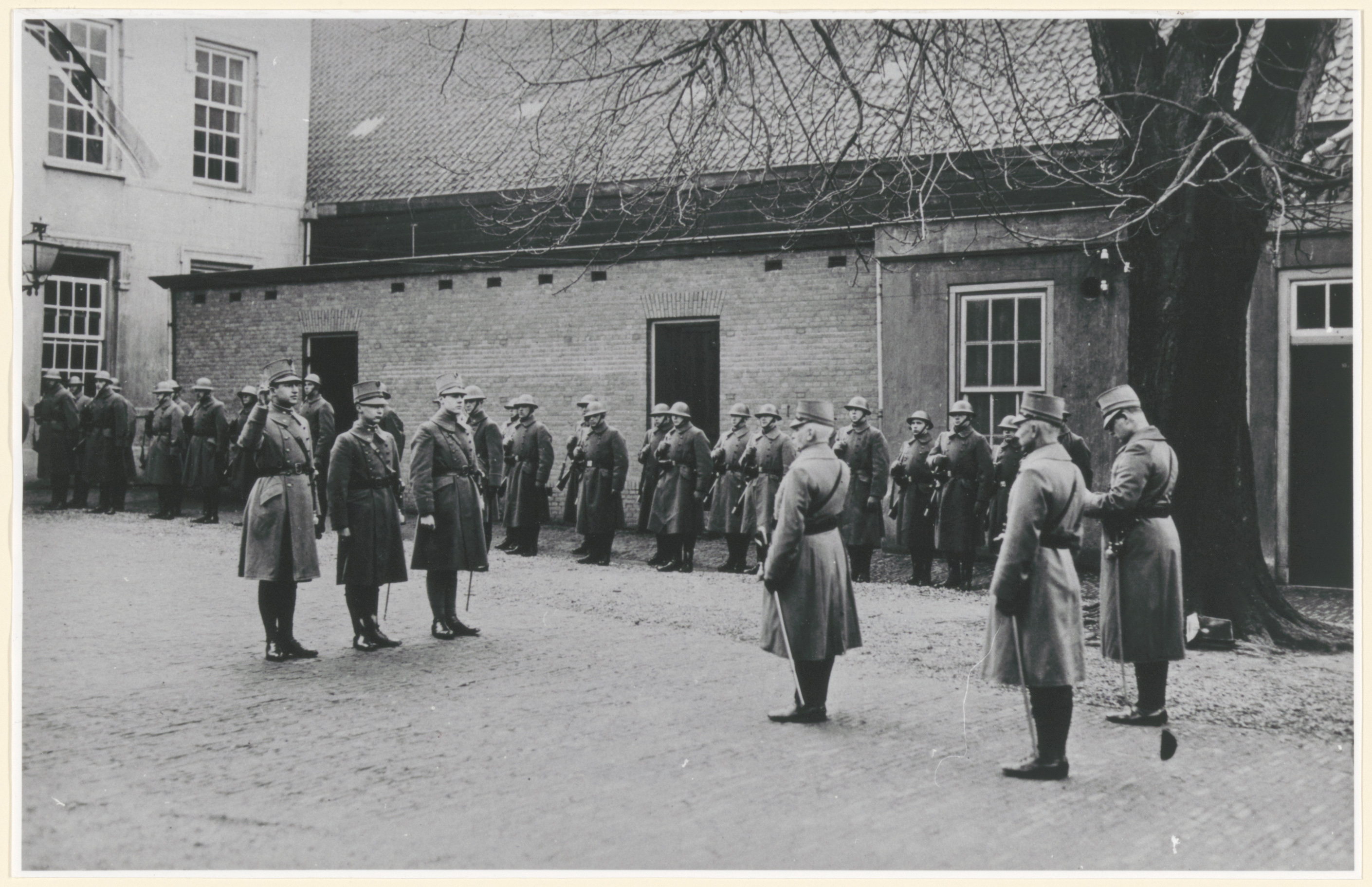 - Beëdiging van drie reserveofficieren van het korps pontonniers en torpedisten op het binnenterrein van de Benthienkazerne aan de Buiten Walevest: de 2e luitenants J.H. Zaaijer, T.C.J. Asselbergs en L.G. van Velthoven. Links in het midden luitenant G. v.d. Mark, voor hem generaal Snijders; de 3e zal korpscommandant luitenant kolonal A. de Kat zijn.