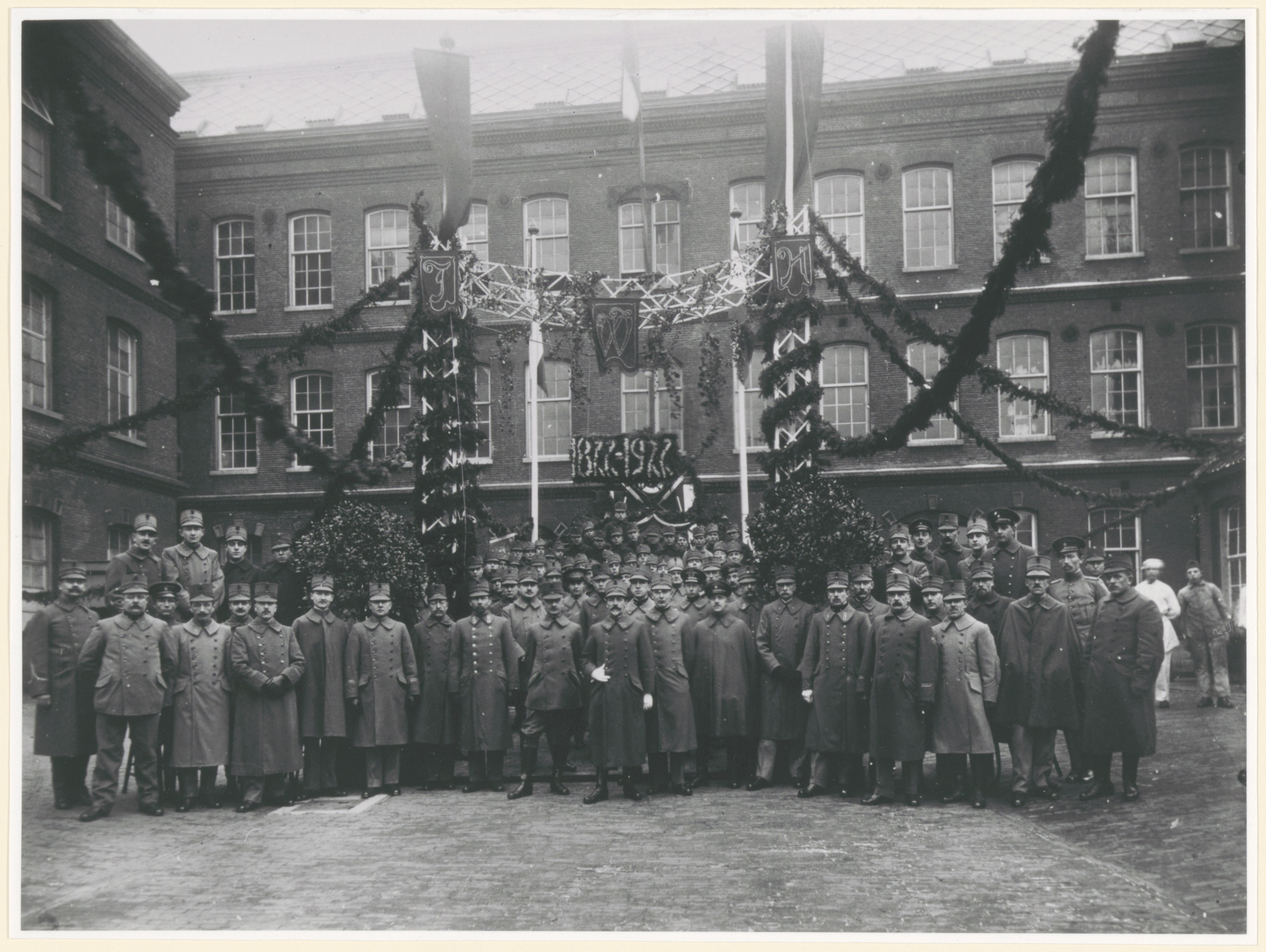 - Officieren en manschappen van het korps pontonniers opgesteld op het terrein van de nieuwe pontonnierskazerne (de zuidwestelijke) aan de Buiten Walevest t.g.v. het 100-jarig bestaan van het korps op 7 januari 1922; een ereboog staat opgericht met de jaartallen 1822-1922 en de letter J(uliana), W(ilhelmina), en H(endrik).